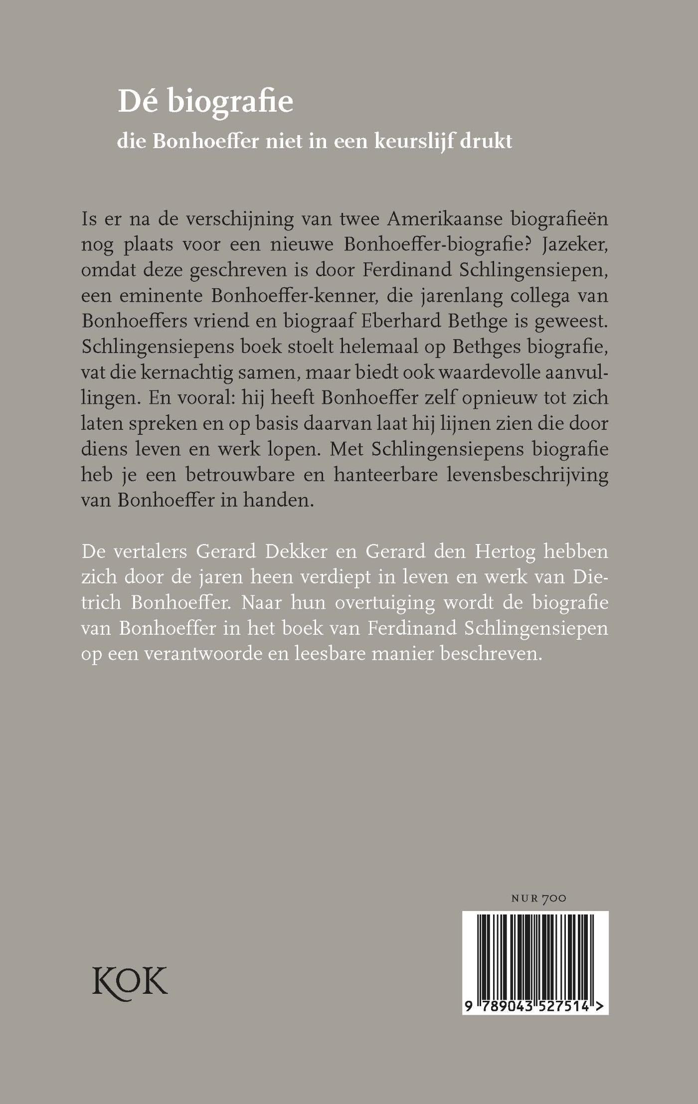 ‘Dietrich Bonhoeffer 1906-1945’ is de meest betrouwbare biografie over Bonhoeffer. Ferdinand Schlingensiepen is een eminente kenner van Bonhoeffers leven en werk. Wie was deze theoloog? De auteur put uit vele bronnen: brieven, gedichten, gebeden, liederen en aantekeningen. Zijn werk is het resultaat van jarenlang systematisch onderzoek en het gebruik van nieuw bronmateriaal. Hij zet een compleet beeld neer van Bonhoeffer als theoloog, schrijver, verzetsstrijder en persoon. ij Hij Gerard Dekker en Gerard den Hertog