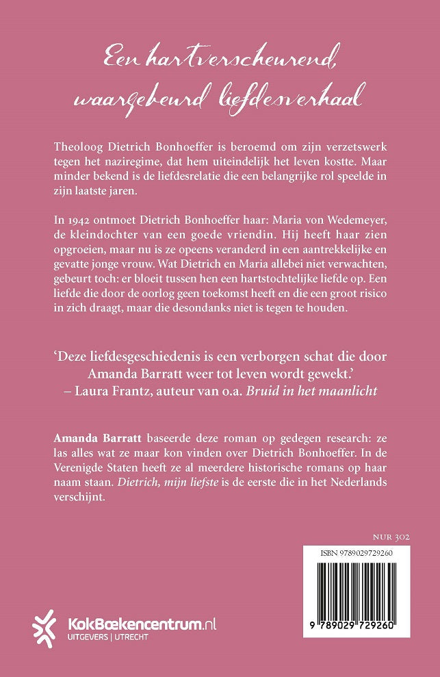 In 1942 ontmoet Dietrich Bonhoeffer haar: Maria von Wedemeyer, de kleindochter van een goede vriendin. Hij heeft haar zien opgroeien, maar nu is ze opeens veranderd in een aantrekkelijke en gevatte jonge vrouw. Wat Dietrich en Maria allebei niet verwachten, gebeurt toch: er bloeit tussen hen een hartstochtelijke liefde op. Een liefde die door de oorlog geen toekomst heeft, die een groot risico in zich draagt, maar die desondanks niet is tegen te houden. In ‘Dietrich, mijn liefste’ beschrijft Amanda Barratt hun meeslepende, waargebeurd liefdesverhaal, gebaseerd op gedetailleerde research.