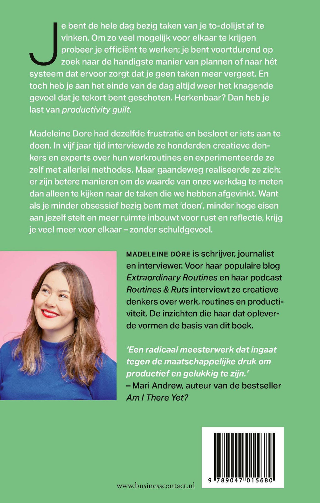 Madeleine Dore had dezelfde frustratie en besloot er iets aan te doen. In vijf jaar tijd interviewde ze honderden creatieve denkers en experts over hun werkroutines en experimenteerde ze zelf met allerlei methodes. Maar gaandeweg realiseerde ze zich: er zijn betere manieren om de waarde van onze werkdag te meten dan alleen te kijken naar de taken die we hebben afgevinkt. Want als je minder obsessief bezig bent met ‘doen’, minder hoge eisen aan jezelf stelt en meer ruimte inbouwt voor rust en reflectie, krijg je veel meer voor elkaar – zonder schuldgevoel.