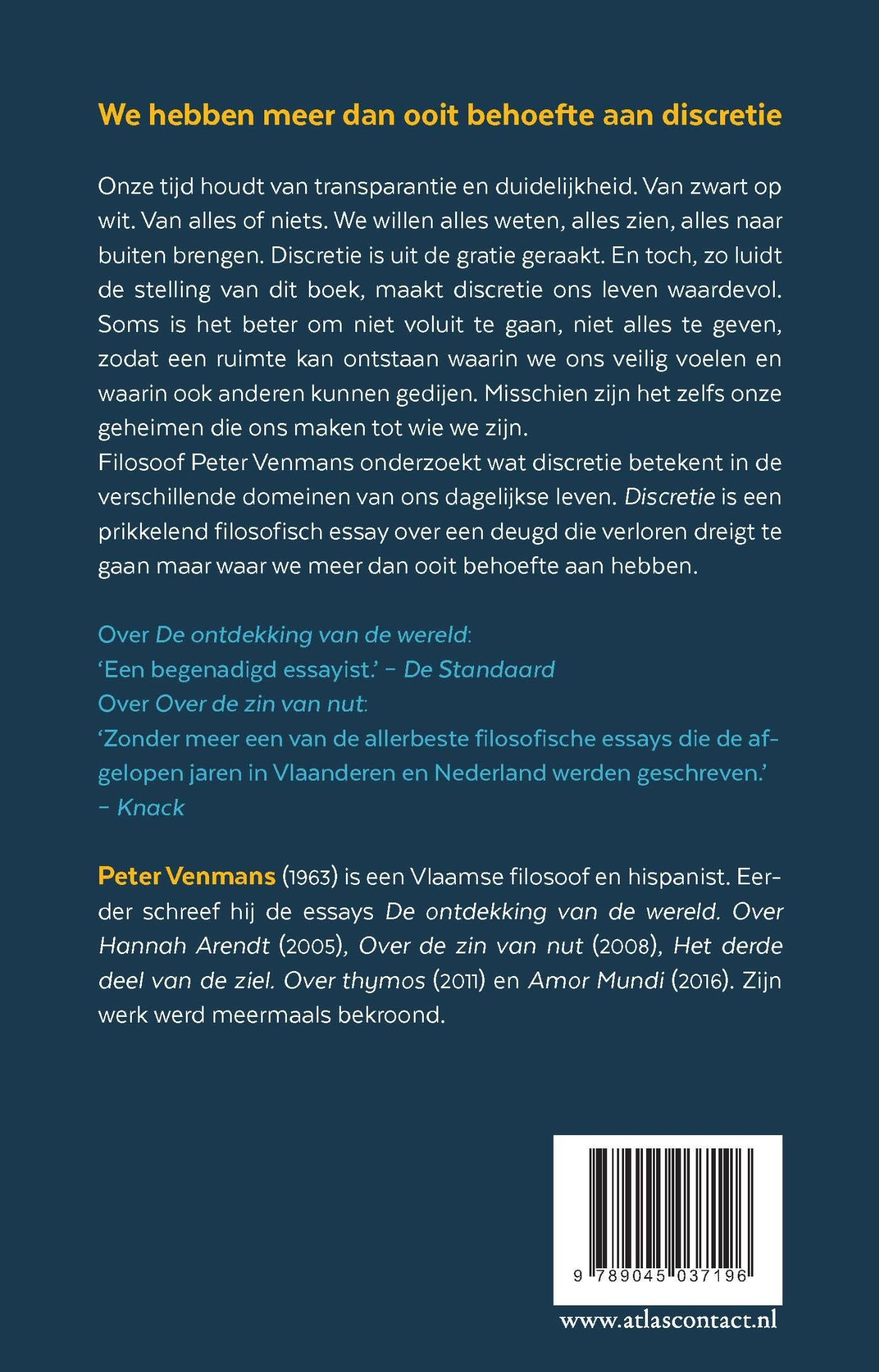 Onze tijd houdt van transparantie en duidelijkheid. Van zwart op wit. Van alles of niets. We willen alles weten, alles zien, alles naar buiten brengen. Discretie is uit de gratie geraakt. En toch, zo luidt de stelling van dit boek, maakt discretie ons leven waardevol. Soms is het beter om niet voluit te gaan, niet alles te geven, zodat een ruimte kan ontstaan waarin we ons veilig voelen en waarin ook anderen kunnen gedijen. Misschien zijn het zelfs onze geheimen die ons maken tot wie we zijn.