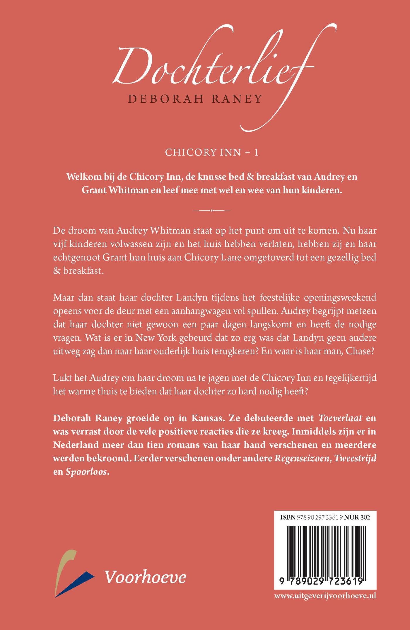 Een goede gastvrouw zijn voor je gasten én voor je kinderen gaat dat wel samen? Deborah Raney schreef een ontroerende familieroman over dit dilemma: `Dochterlief . De droom van Audrey Whitman gaat eindelijk uitkomen. Nu haar vijf kinderen volwassen zijn, gaat ze met haar echtgenoot Grant haar huis aan Chicory Lane omtoveren tot een knus bed & breakfast. Maar vlak voor het feestelijke openingsweekend slaan de zenuwen toe als haar dochter Landyn met een verhuiswagen het erf op rijdt. Lukt het Audrey om haar droom na te jagen met de Chicory Inn en tegelijkertijd het warme thuis te bieden dat haar dochter nu zo hard nodig heeft? `Dochterlief is het eerste deel van de serie `The Chicory Inn .
