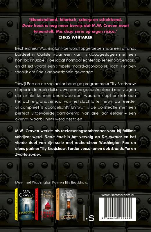 Dode hoek is na Brandoffer, Zwarte zomer en De curator de vierde thriller van supertalent M.W. Craven. Voor zijn debuut won Craven de prestigieuze Golden Dagger Award.