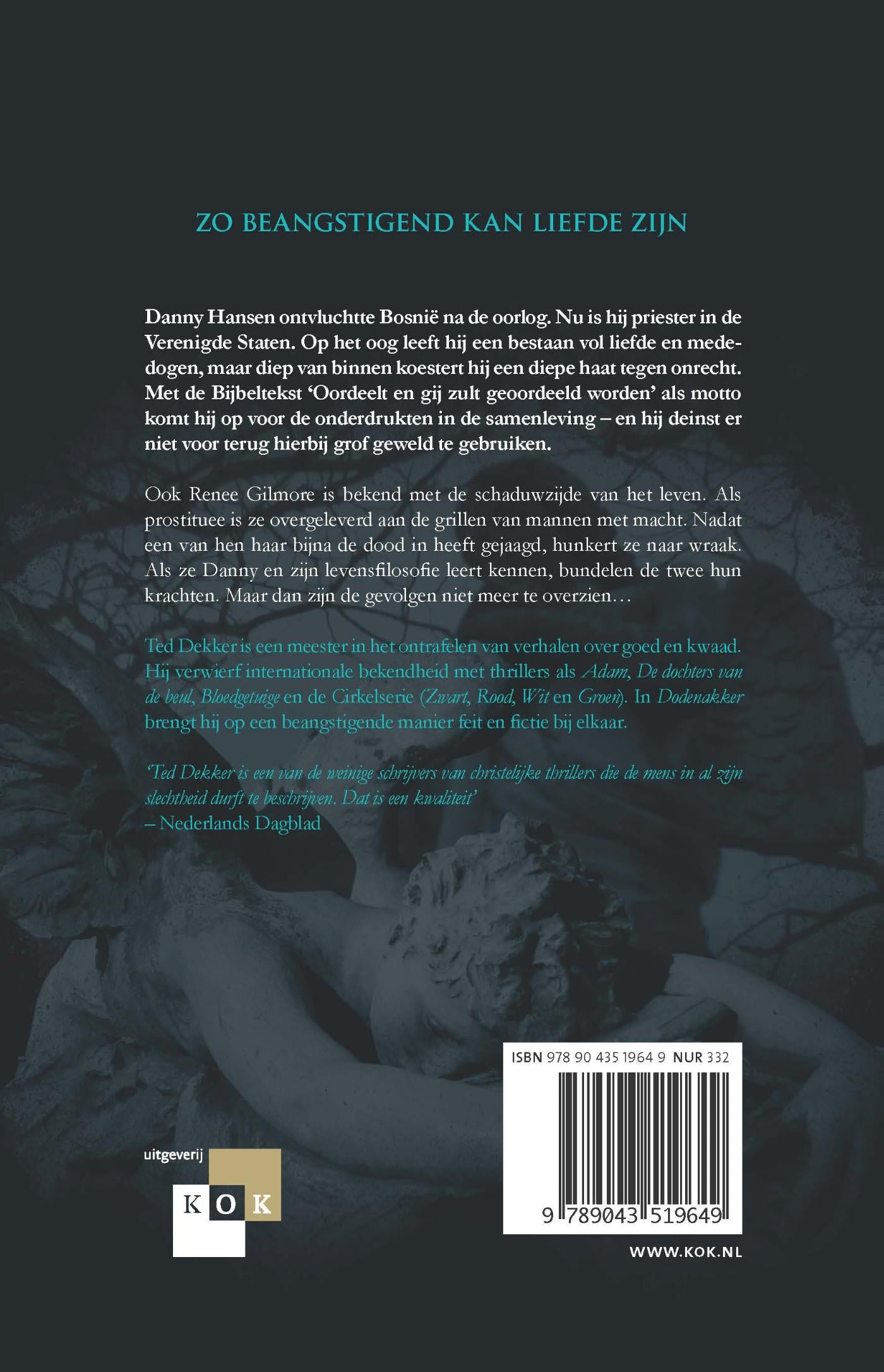 Danny Hansen ontvluchtte Bosnië na de oorlog. Nu is hij priester in de Verenigde Staten. Zo op het oog leeft hij een bestaan vol liefde en mededogen, maar diep van binnen koestert hij een diepe haat tegen onrecht vooral wanneer die wordt veroorzaakt door hypocriete gelovigen. De priester zet de Bijbeltekst `Oordeelt en gij zult geoordeeld worden naar eigen hand en besluit zelf in te grijpen in de samenleving. Wat krom is, buigt hij eigenhandig recht en hij deinst er niet voor terug hierbij grof geweld te gebruiken. Dan kruist zijn pad dat van Renee Gilmore. Zij blijkt het slachtoffer van een man die zijn macht misbruikt. Nadat ze aan zijn klauwen is ontsnapt, heeft ze slechts één doel voor ogen: wraak nemen. Als ze Danny en zijn levensfilosofie leert kennen, bundelen de twee hun krachten. Maar dan zijn de gevolgen niet meer te overzien. In Dodenakker brengt Ted Dekker op een beangstigende manier feit en fictie bij elkaar zoals geen ander dat kan. Opnieuw is het hem gelukt een superspannend verhaal uit te denken met voor de kenner een sterke christelijke boodschap.