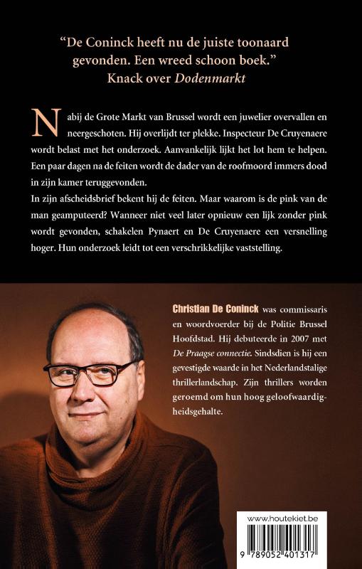 Maar waarom is de pink van de man geamputeerd? Wanneer niet veel later opnieuw een lijk zonder pink wordt gevonden, schakelen Pynaert en De Cruyenaere een versnelling hoger. Hun onderzoek leidt tot een verschrikkelijke vaststelling.