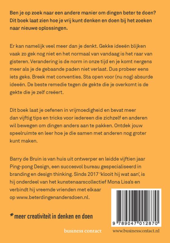 In ‘Doe eens gek’ laat Barry de Bruin zien hoe je vrij kunt denken en doen bij het zoeken naar nieuwe oplossingen. Ideaal voor als je op zoek bent naar een andere manier om dingen beter te doen.