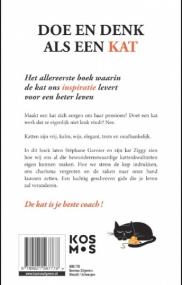 In Doe en denk als een kat laat Stéphane Garnier op een vrolijke manier zien wat wij van katten kunnen leren. Maakt een kat zich druk om haar pensioen? Of doet ze werk dat ze eigenlijk niet leuk vindt? Nee, poezen zijn vrij, kalm, wijs, elegant, trots en onafhankelijk. In dit boek lees je hoe wij ons die bewonderenswaardige kattenkwaliteiten eigen kunnen maken. Hoe we stress de kop kunnen indrukken, ons charisma kunnen vergroten en belangrijke zaken naar onze hand kunnen zetten.