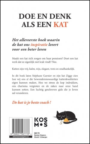 In Doe en denk als een kat laat Stéphane Garnier op een vrolijke manier zien wat wij van katten kunnen leren. Maakt een kat zich druk om haar pensioen? Of doet ze werk dat ze eigenlijk niet leuk vindt? Nee, poezen zijn vrij, kalm, wijs, elegant, trots en onafhankelijk. In dit boek lees je hoe wij ons die bewonderenswaardige kattenkwaliteiten eigen kunnen maken. Hoe we stress de kop kunnen indrukken, ons charisma kunnen vergroten en belangrijke zaken naar onze hand kunnen zetten.
