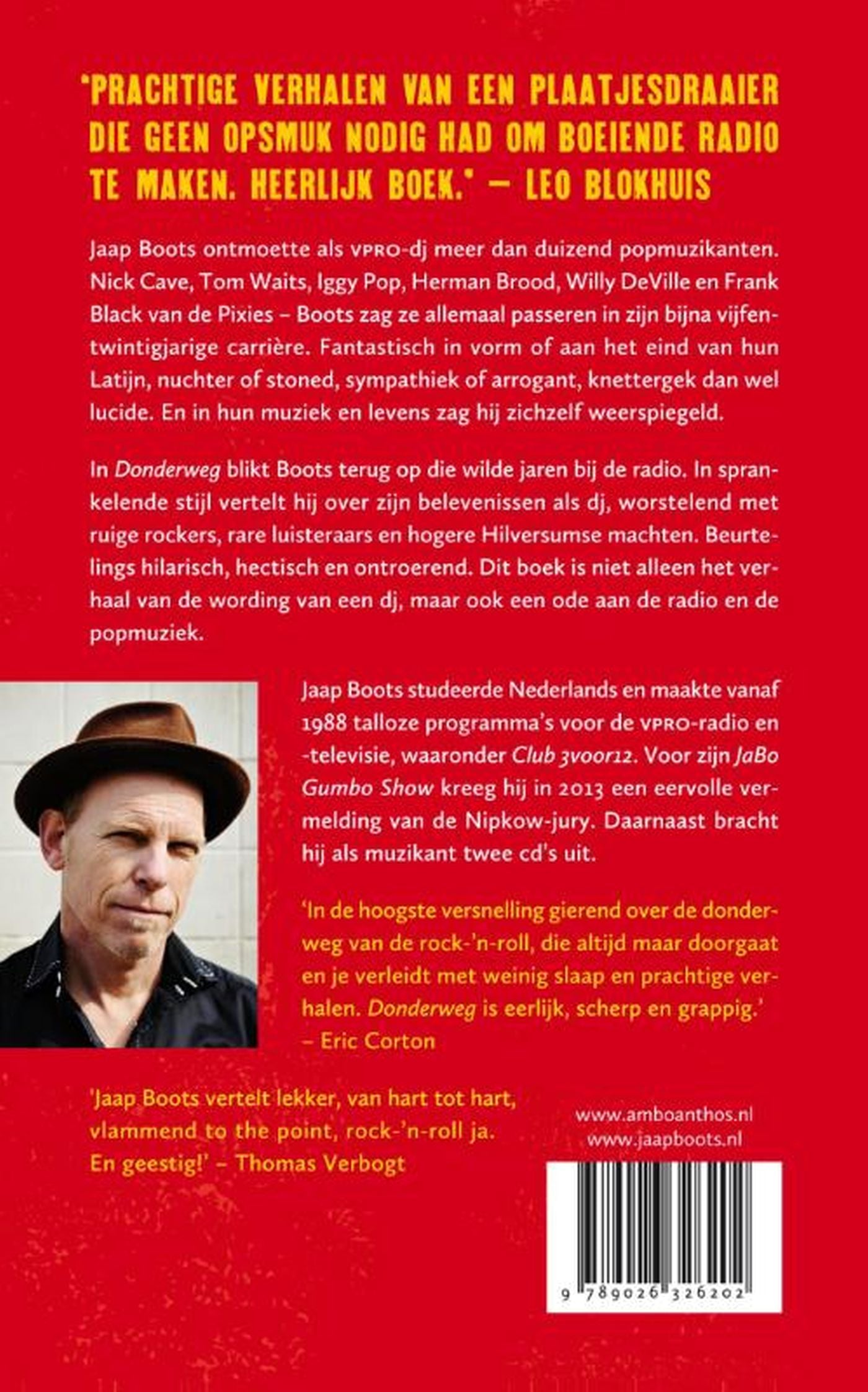 In 'Donderweg' blikt Jaap Boots terug op zijn wilde jaren bij de radio. Als VPRO-dj ontmoette hij meer dan duizend muzikanten uit de popmuziek: Nick Cave, Tom Waits, Iggy Pop, Herman Brood, Willy DeVille en Frank Black van de Pixies. Fantastisch in vorm of aan het eind van hun Latijn, nuchter of stoned, sympathiek of arrogant, knettergek dan wel lucide Jaap Boots zag ze allemaal passeren. In hun muziek en levens zag hij zichzelf weerspiegeld.