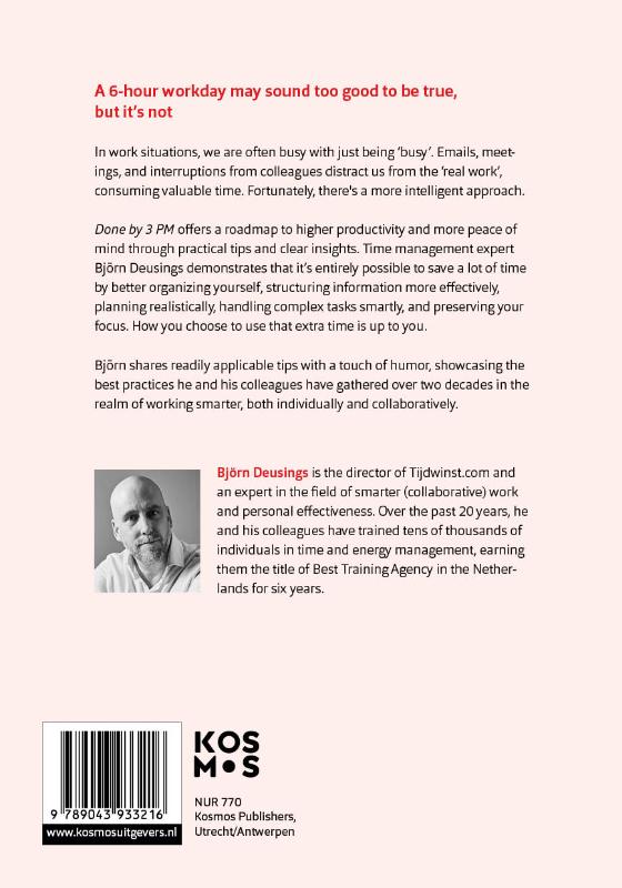 Done by 3 PM offers a roadmap to higher productivity and more peace of mind through practical tips and clear insights. Time management expert Björn Deusings demonstrates that it’s entirely possible to save a lot of time by better organizing yourself, structuring information more effectively, planning realistically, handling complex tasks smartly, and preserving your focus. How you choose to use that extra time is up to you.
