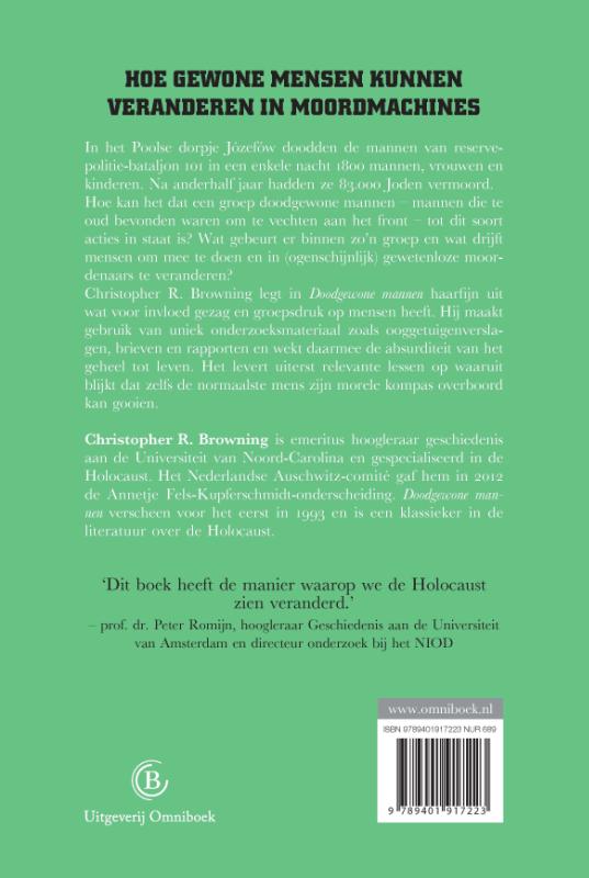 In de vroege ochtend van 13 juli 1942 trekt een reserve politiebataljon van de Ordnungspolizei het Poolse dorpje Józefów binnen. Deze Duitsers waren tot voor kort heel gewone mannen uit de omgeving van Hamburg. Maar als de nacht valt, zijn vrijwel alle 1800 Joden uit het dorpje vermoord. Zestien maanden lang werkt het bataljon mee aan de deportatie en executie van Poolse Joden. Hoe kan het dat doodgewone mannen hiertoe in staat bleken? Brownings unieke onderzoek verschaft een tijdloos antwoord op die vraag.