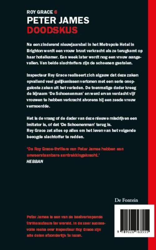 Doodskus is deel 6 in de Roy Grace-serie van Peter James waarvan alle delen los te lezen zijn. Na een zinderend Nieuwjaarsbal in het Metropole Hotel in Brighton wordt een vrouw bruut verkracht als ze terugkomt op haar kamer. Een week later wordt nog een vrouw aangevallen. Van beide slachtoffers zijn de schoenen gestolen. Inspecteur Roy Grace realiseert zich algauw dat deze zaken opvallend veel gelijkenissen vertonen met een serie onopgeloste zaken uit 1997. De toenmalige dader kreeg de bijnaam Ôde SchoenenmanÕ en werd ervan verdacht vijf vrouwen te hebben verkracht alvorens hij een zesde vrouw vermoordde. Is de dader van deze nieuwe misdaden een imitator, of is de Schoenenman terug? Peter James is een van de bestverkopende thrillerauteurs ter wereld. Doodskus is het zesde boek in de verslavende en uiterst succesvolle reeks over inspecteur Roy Grace, waarvan de delen afzonderlijk te lezen zijn.