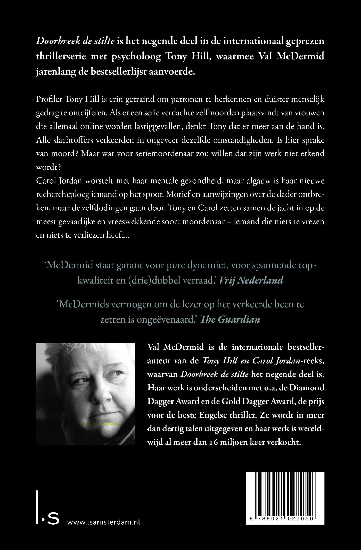 (POD) In Doorbreek de stilte, deel negen van Val McDermids internationaal geprezen thrillerserie met Tony Hill, vindt een serie verdachte moorden plaats van vrouwen die online worden lastiggevallen. Profiler Tony Hill is erin getraind patronen te herkennen en duister menselijk gedrag te ontcijferen en denkt dat er meer aan de hand is. Is er hier sprake van moord?