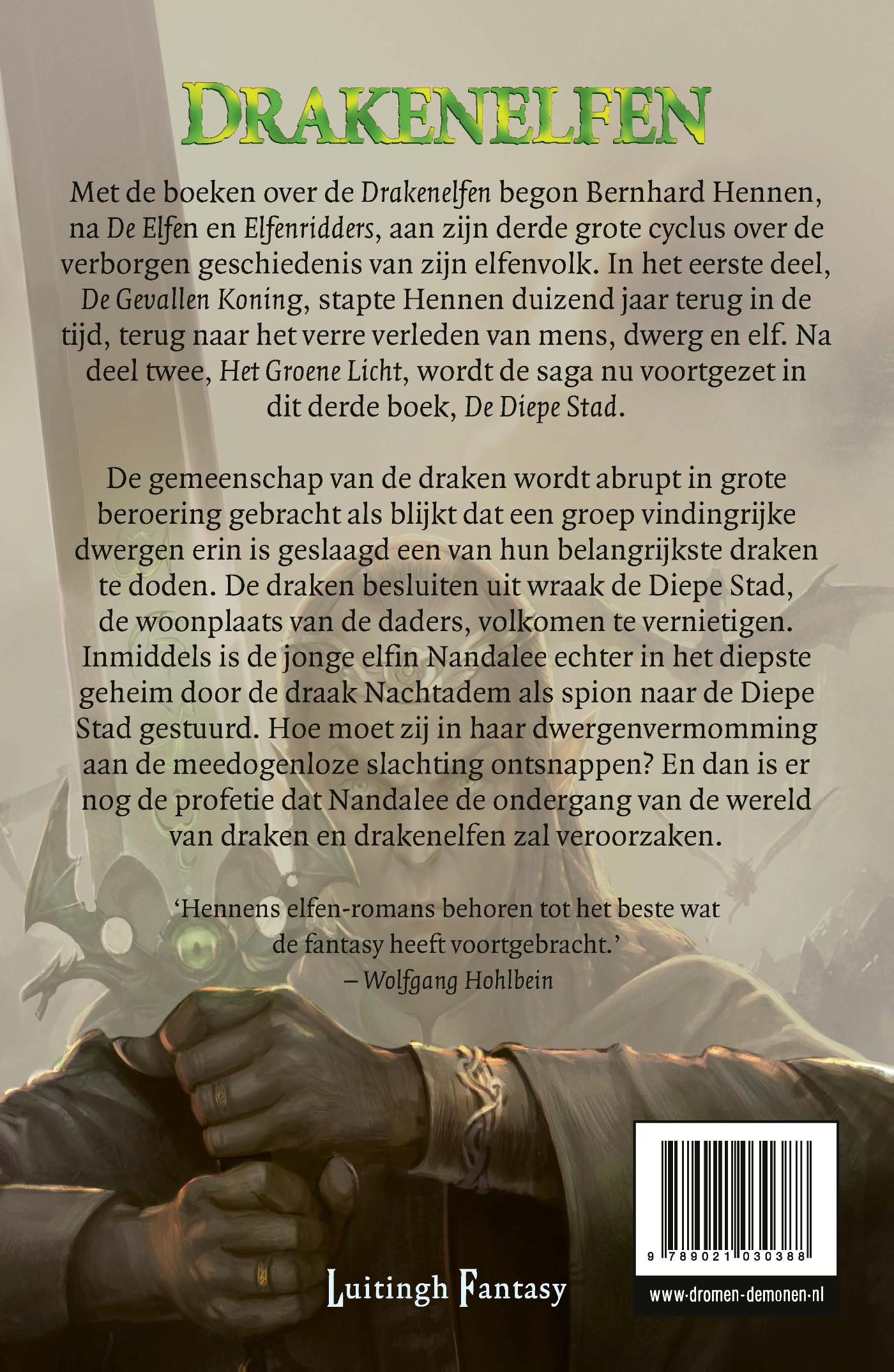 (POD) Met de boeken over de Drakenelfen begon Bernhard Hennen, na De Elfen en Elfenridders, aan zijn derde grote cyclus over de verborgen geschiedenis van zijn elfenvolk. In het eerste deel, De Gevallen Koning, stapte Hennen duizend jaar terug in de tijd, terug naar het verre verleden van mens, dwerg en elf. Na deel twee, Het Groene Licht, wordt de saga nu voortgezet in dit derde boek, De Diepe Stad.