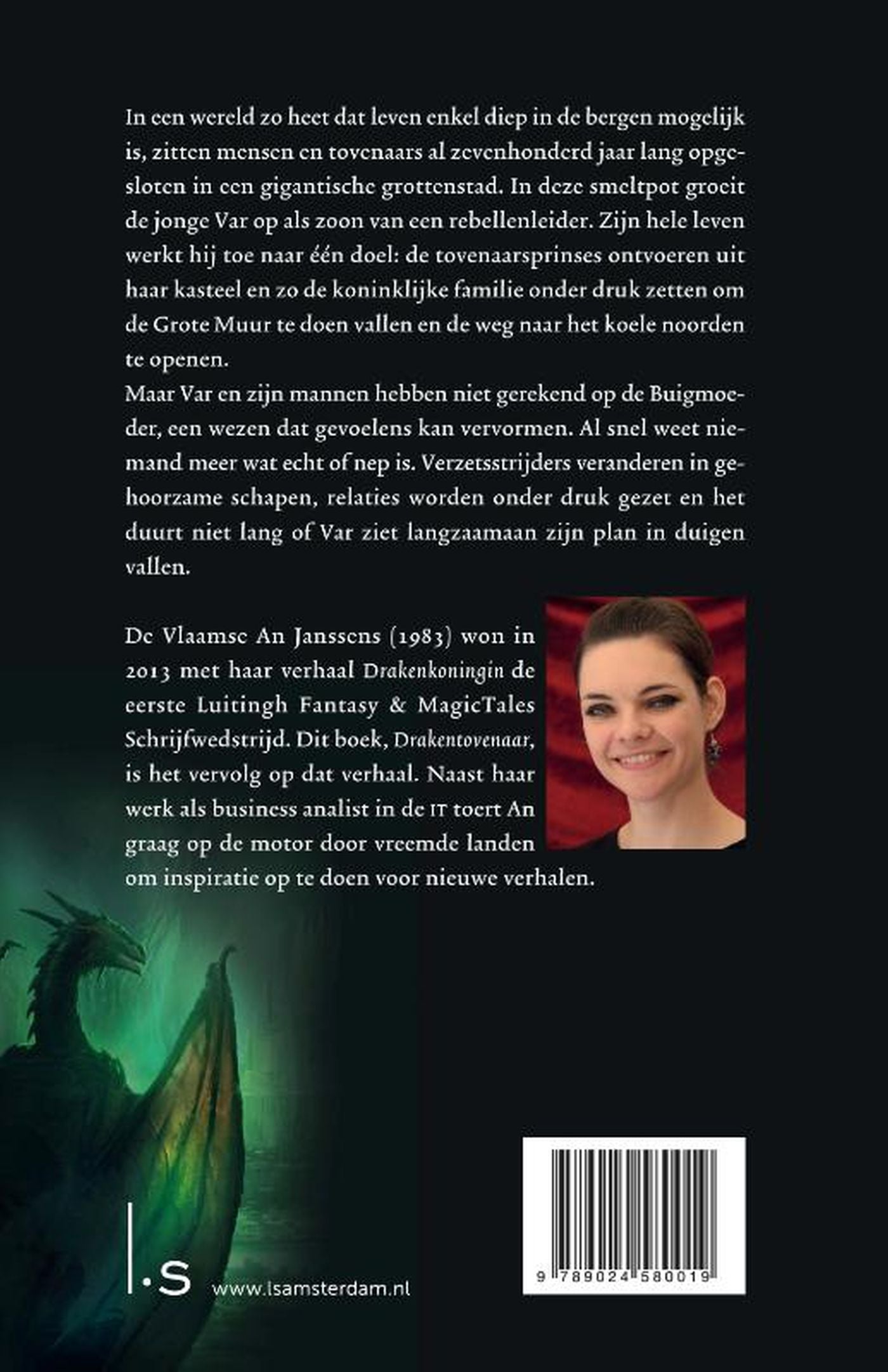 De Vlaamse An Janssens (1983) won in 2013 met haar verhaal Drakenkoningin de eerste Luitingh Fantasy & MagicTales Schrijfwedstrijd. Dit boek, Drakentovenaar, is het vervolg op dat verhaal. Naast haar werk als business analist in de IT toert An graag op de motor door vreemde landen om inspiratie op te doen voor nieuwe verhalen.