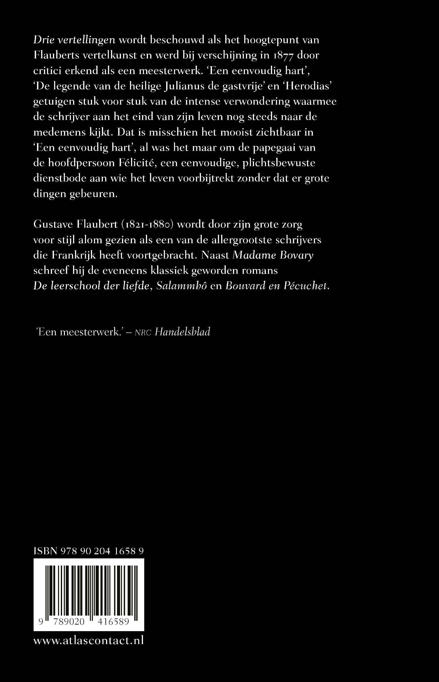 ‘Drie vertellingen’ van Gustave Flaubert wordt beschouwd als het hoogtepunt van Flauberts vertelkunst en werd bij verschijning in 1877 door critici erkend als een meesterwerk. ‘Een eenvoudig hart’, ‘De legende van de heilige Julianus de gastvrije’ en ‘Herodias’ getuigen stuk voor stuk van de intense verwondering waarmee de schrijver aan het eind van zijn leven nog steeds naar de medemens kijkt. Dat is misschien het mooist zichtbaar in ‘Een eenvoudig hart’, al was het maar om de papegaai van de hoofdpersoon Félicité, een eenvoudige, plichtsbewuste dienstbode aan wie het leven voorbijtrekt zonder dat er grote dingen gebeuren.