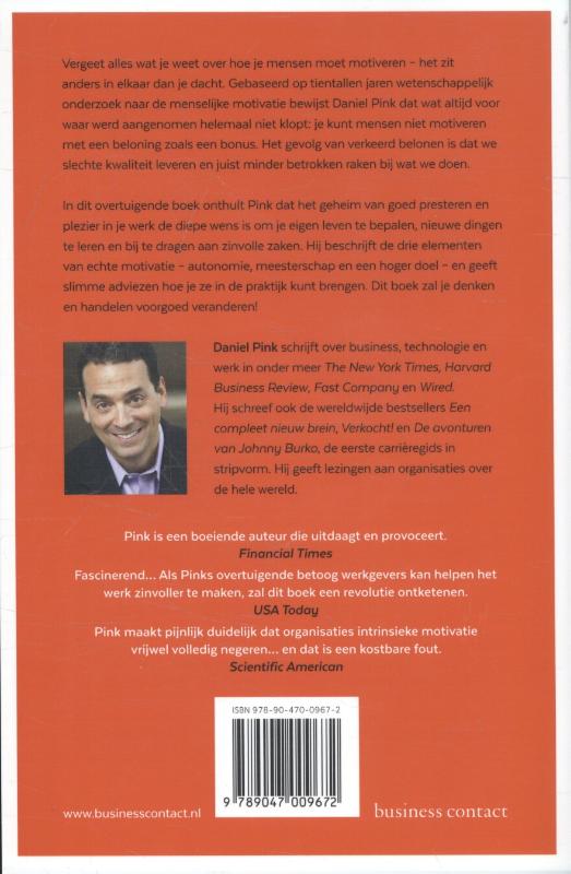 Gebaseerd op vijftig jaar wetenschappelijk onderzoek naar menselijk gedrag en motivatie onthult Pink de mismatch tussen wat de wetenschap weet en wat het bedrijfsleven doet. Hij bestudeert de drie elementen van echte motivatie – autonomie, meesterschap en een hoger doel – en komt met slimme en verrassende oplossingen om mensen beter te laten presteren. Het boek stond jarenlang in de bestsellerlijst van The New York Times en werd vertaald in meer dan 30 talen. In Nederland en België zijn er al meer dan 10.000 exemplaren verkocht. Verplichte kost dus voor iedereen die wil weten wat mensen écht motiveert.