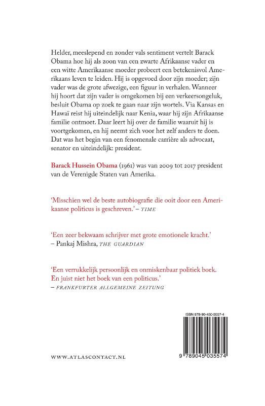 In ‘Dromen van mijn vader’ vertelt Barack Obama helder, meeslepend en zonder vals sentiment hoe hij als zoon van een zwarte Afrikaanse vader en een witte Amerikaanse moeder probeert een betekenisvol Amerikaans leven te leiden. Hij is opgevoed door zijn moeder; zijn vader was de grote afwezige, een figuur in verhalen. Wanneer hij hoort dat zijn vader is omgekomen bij een verkeersongeluk, besluit Obama op zoek te gaan naar zijn wortels. Via Kansas en Hawaï reist hij uiteindelijk naar Kenia, waar hij zijn Afrikaanse familie ontmoet. Daar leert hij over de familie waaruit hij is voortgekomen, en hij neemt zich voor het zelf anders te doen. Dat was het begin van een fenomenale carrière als advocaat, senator en uiteindelijk: president.