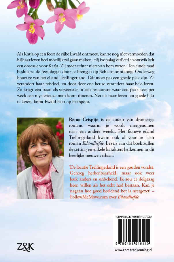 Op de vlucht voor een engerd die alles uit de kast trekt om haar te versieren besluit hoofdpersoon Katja in ‘Droomplek’ van Reina Crispijn de feestdagen door te brengen op Schiermonnikoog. Onderweg hoort ze van het eiland Trellingerland. Dát moet pas een goede plek zijn. Ze verandert haar reisdoel, en door deze ene keuze verandert haar hele leven. ‘Droomplek’ is een zelfstandig te lezen roman met nieuwe personages die je terugvoert naar de door Reina Crispijn bedachte droomplek Trellingerland, die al eerder voorkwam in haar roman ‘Eilandliefde’.
