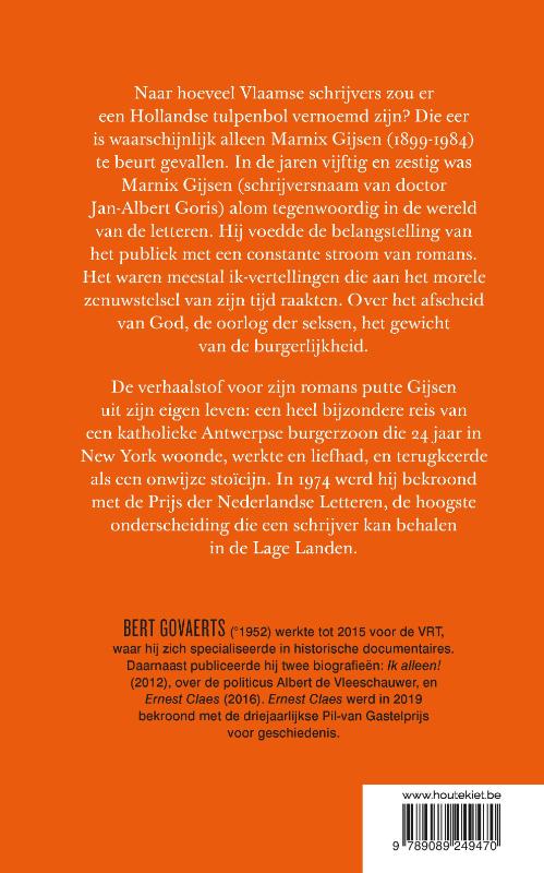 Naar hoeveel Vlaamse schrijvers zou een Hollandse tulpenbol vernoemd zijn? Die eer is waarschijnlijk alleen Marnix Gijsen (1899-1984) te beurt gevallen. In de jaren vijftig en zestig was Marnix Gijsen (schrijversnaam van doctor Jan-Albert Goris) alomtegenwoordig in de wereld van de letteren. Hij voedde de belangstelling van het publiek met een constante stroom van romans. Het waren meestal ik-vertellingen die aan het morele zenuwstelsel van zijn tijd raakten: het afscheid van God, de oorlog der seksen, het gewicht van de burgerlijkheid.