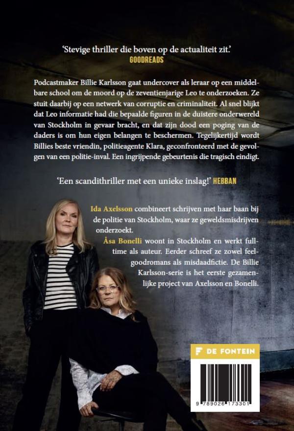 Billlie Karlsson-serie boek 2. Podcastmaker Billie Karlsson gaat undercover als leraar op een middelbare school om de moord op de zeventienjarige Leo te onderzoeken. Ze stuit daarbij op een netwerk van corruptie en criminaliteit. Al snel blijkt dat Leo informatie had die bepaalde figuren in de duistere onderwereld van Stockholm in gevaar bracht en dat zijn dood een poging van de daders is om hun eigen belangen te beschermen. Tegelijkertijd wordt Billies beste vriendin, politieagente Klara, geconfronteerd met de gevolgen van een politie-inval die tragisch eindigt.