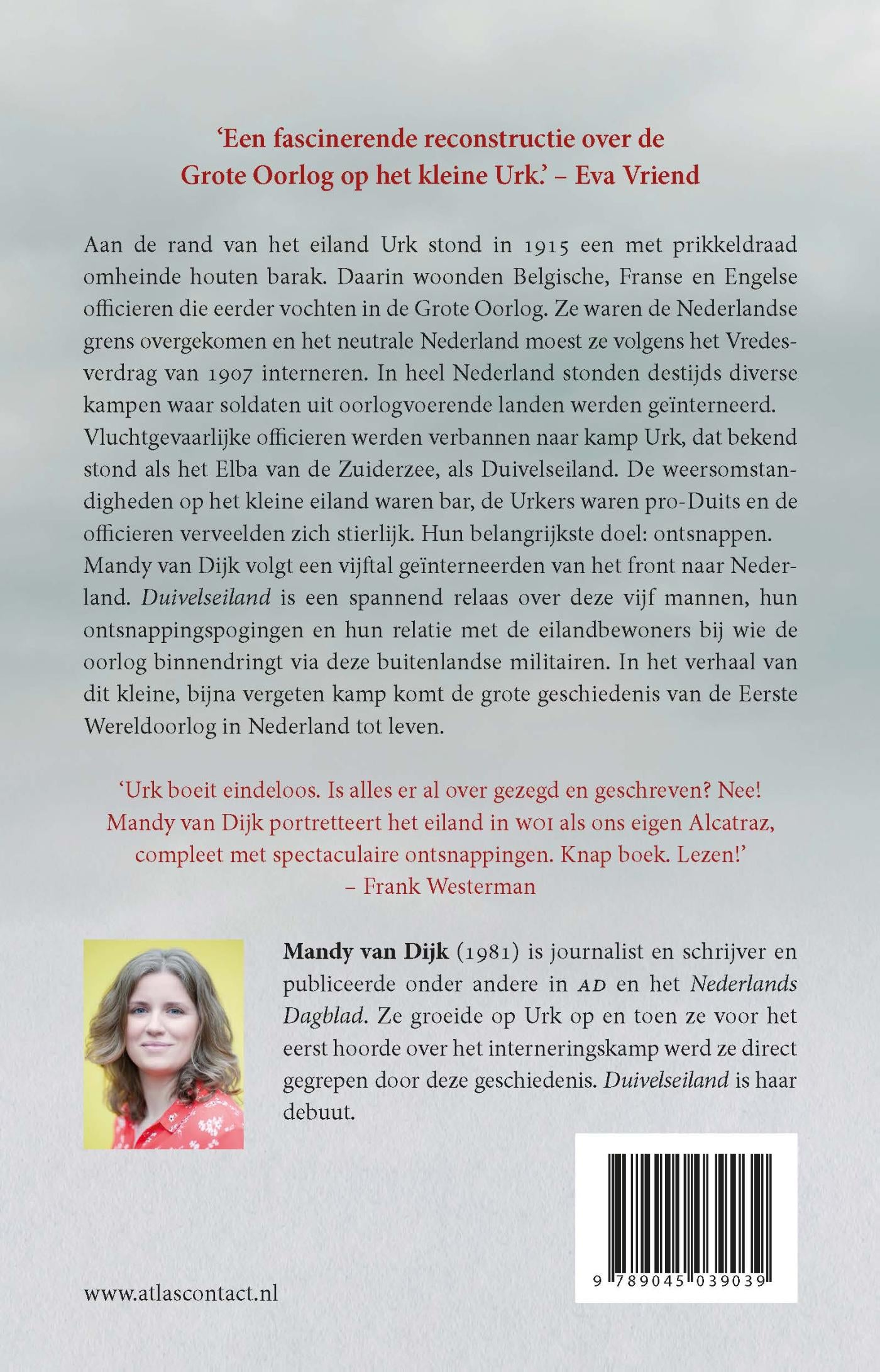 ‘Duivelseiland’ is Mandy van Dijks debuut over Urk ten tijde van de Eerste Wereldoorlog. Aan de rand van het eiland Urk stond in 1915 een met prikkeldraad omheinde houten barak. Daarin woonden Belgische, Franse en Engelse officieren die eerder vochten inde Grote Oorlog. Ze waren de Nederlandse grens overgekomen en het neutrale Nederland moest ze volgens het Vredesverdrag van 1907 interneren. In heel Nederland stonden destijds diverse kampen waar soldaten uit oorlogvoerende landen werden geïnterneerd.