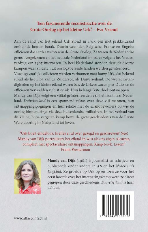 ‘Duivelseiland’ is Mandy van Dijks debuut over Urk ten tijde van de Eerste Wereldoorlog. Aan de rand van het eiland Urk stond in 1915 een met prikkeldraad omheinde houten barak. Daarin woonden Belgische, Franse en Engelse officieren die eerder vochten inde Grote Oorlog. Ze waren de Nederlandse grens overgekomen en het neutrale Nederland moest ze volgens het Vredesverdrag van 1907 interneren. In heel Nederland stonden destijds diverse kampen waar soldaten uit oorlogvoerende landen werden geïnterneerd.