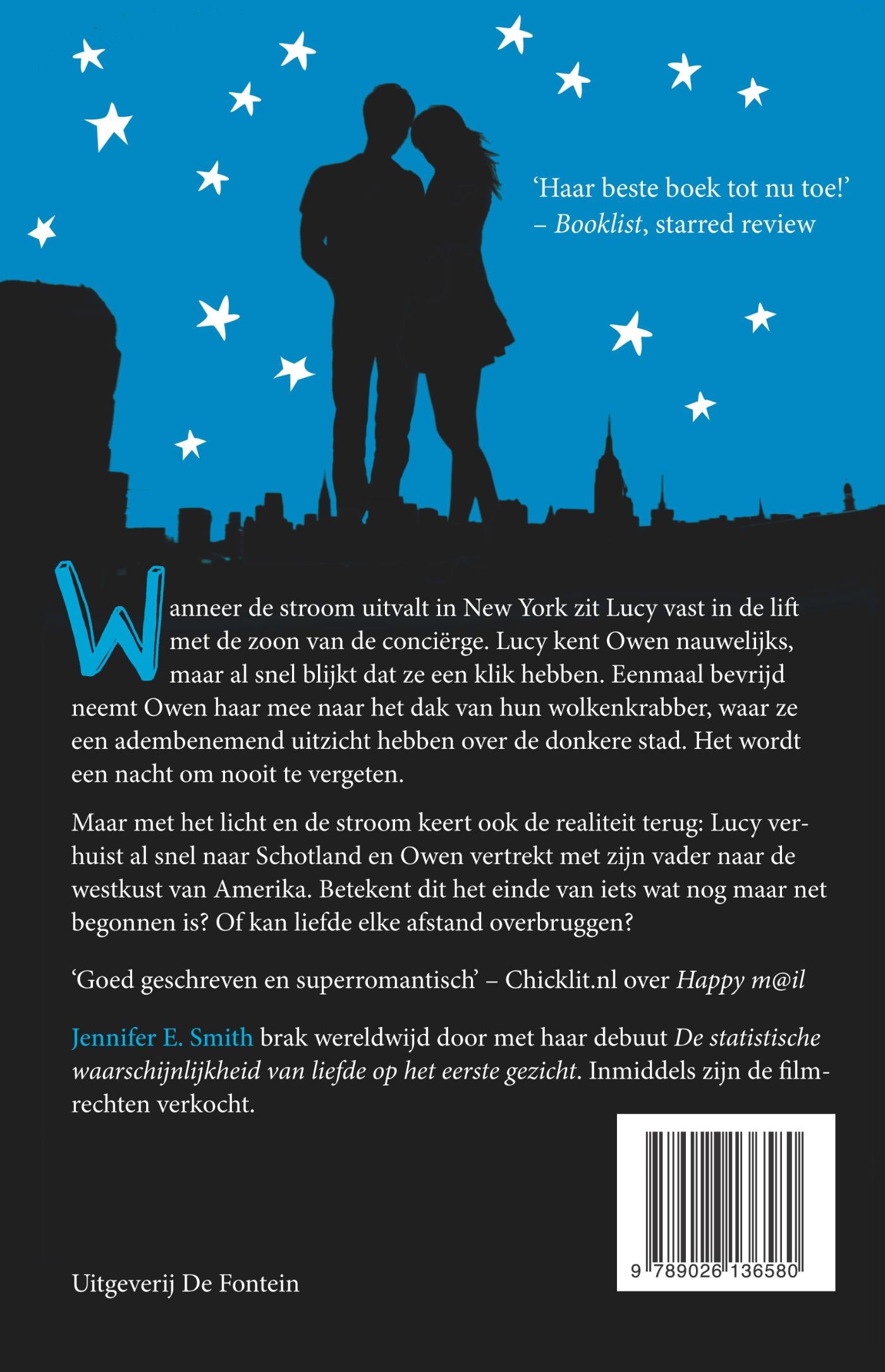 Duizend kilometer tussen jou en mij is het heerlijke, onweerstaanbare verhaal van Lucy en Owen die elkaar in een lift ontmoeten en op slag verliefd worden. Schrijfster Jennifer E. Smith, bekend van de bestseller De statistische waarschijnlijkheid van liefde op het eerste gezicht, heeft opnieuw een prachtige jeugdroman geschreven. Wanneer de stroom uitvalt in New York zit Lucy vast in de lift met de zoon van de conciërge. Lucy kent Owen nauwelijks, maar al snel blijkt dat ze een klik hebben. Eenmaal bevrijd neemt Owen haar mee naar het dak van hun wolkenkrabber, waar ze een magnifiek uitzicht hebben over donker New York. Het wordt een magische nacht. Met het licht keert ook de realiteit terug: Owen verhuist naar de westkust en Lucy vertrekt naar Schotland. Betekent dit het einde? Of kan liefde elke afstand overbruggen? Jennifer E. Smith groeide op in de buurt van Chicago en woont in New York. Ze werkt als redacteur bij een Amerikaanse uitgeverij. Haar debuut De statistische waarschijnlijkheid van liefde op het eerste gezicht werd wereldwijd een groot succes, gevolgd door Happy m@il. Duizend kilometer tussen jou en mij is haar derde young adult-roman.