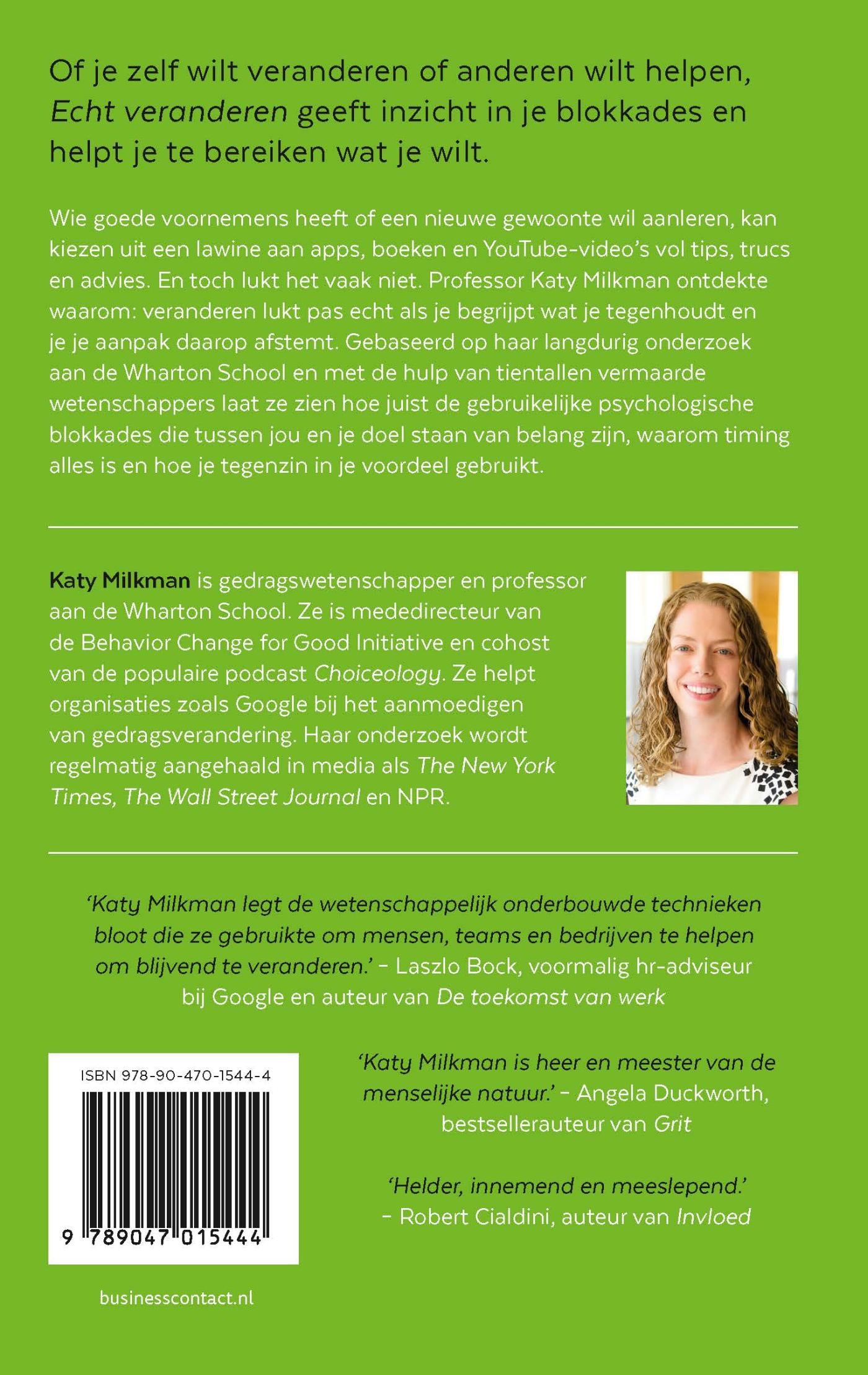 Of je zelf wilt veranderen of anderen wilt helpen, Echt veranderen van Katy Milkman geeft inzicht in je blokkades en helpt je te bereiken wat je wilt. Wie goede voornemens heeft of een nieuwe gewoonte wil aanleren, kan kiezen uit een lawine aan apps, boeken en YouTube-video’s vol tips, trucs en advies. En toch lukt het vaak niet. Professor Katy Milkman ontdekte waarom: veranderen lukt pas echt als je begrijpt wat je tegenhoudt en je je aanpak daarop afstemt. Gebaseerd op haar langdurig onderzoek aan de Wharton School en met de hulp van tientallen vermaarde wetenschappers laat ze zien hoe juist de gebruikelijke psychologische blokkades die tussen jou en je doel staan van belang zijn, waarom timing alles is en hoe je tegenzin in je voordeel gebruikt.