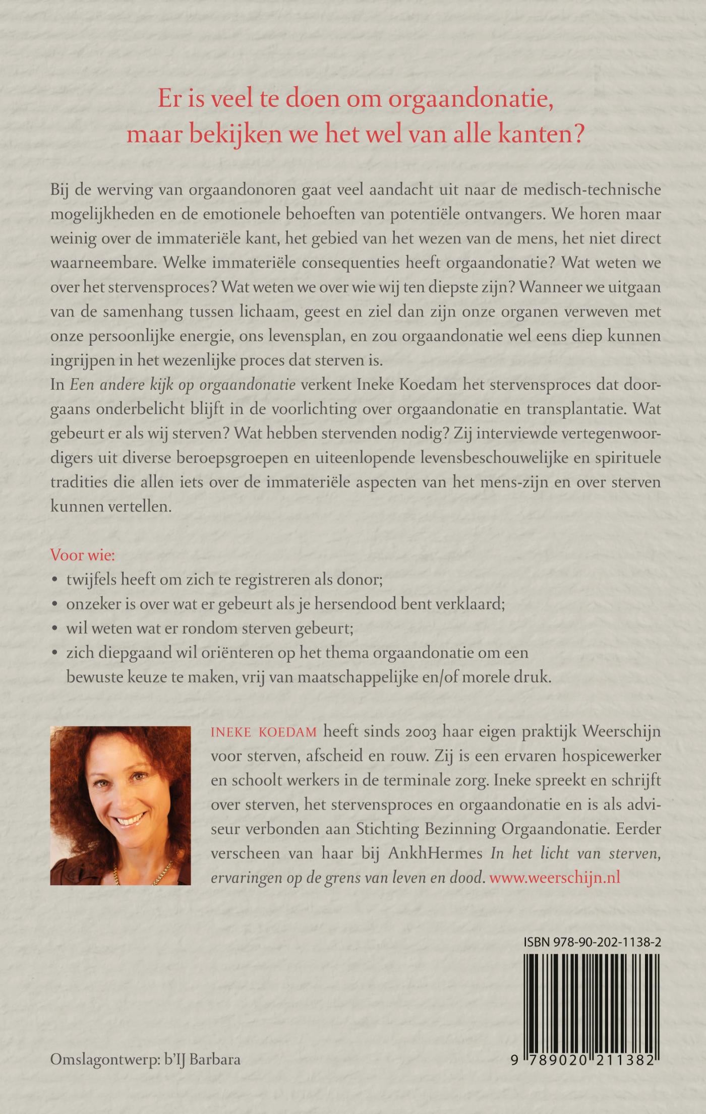 Ineke Koedam wil met Een andere kijk op orgaandonatie, meer dan een medische ingreep een bredere kijk op orgaandonatie stimuleren. Er is veel te doen over orgaandonatie, maar we bekijken het meestal alleen vanuit de medische of emotionele kant. Als we uitgaan van een holistisch mensbeeld, dan zou orgaandonatie weleens diep in kunnen grijpen in het stervensproces. Wat betekent orgaandonatie voor de ziel, het niet waarneembare? In Een andere kijk op orgaandonatie interviewt Ineke Koedam vertegenwoordigers uit diverse beroepsgroepen en uiteenlopende spirituele tradities die iets over die immateriële kant van het mens-zijn en sterven kunnen zeggen, waaronder Willem Glaudemans en Pim van Lommel.