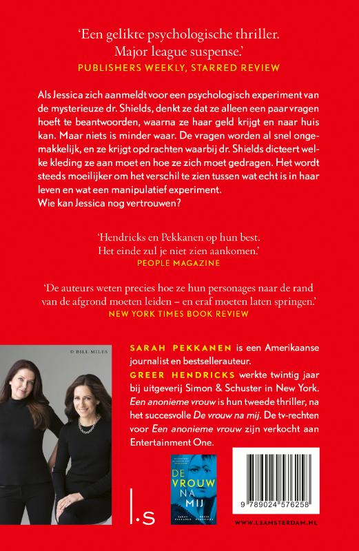 Een anonieme vrouw van Sarah Pekkanen en Greer Hendricks is een razend spannende thriller over een gevaarlijke obsessie. Eerder verscheen van dit schrijversduo De vrouw na mij.