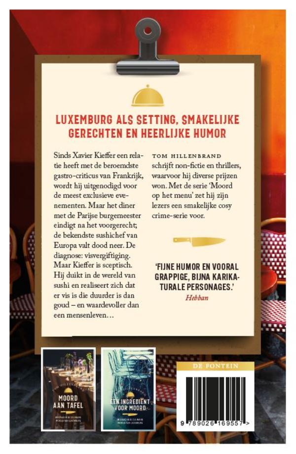 Een dodelijke delicatesse is het tweede boek in de Moord op het menu-serie van Tom Hillenbrand. De avonturen van Xavier Kieffer begonnen in Moord aan tafel en gaan verder in Een ingrediënt voor moord.