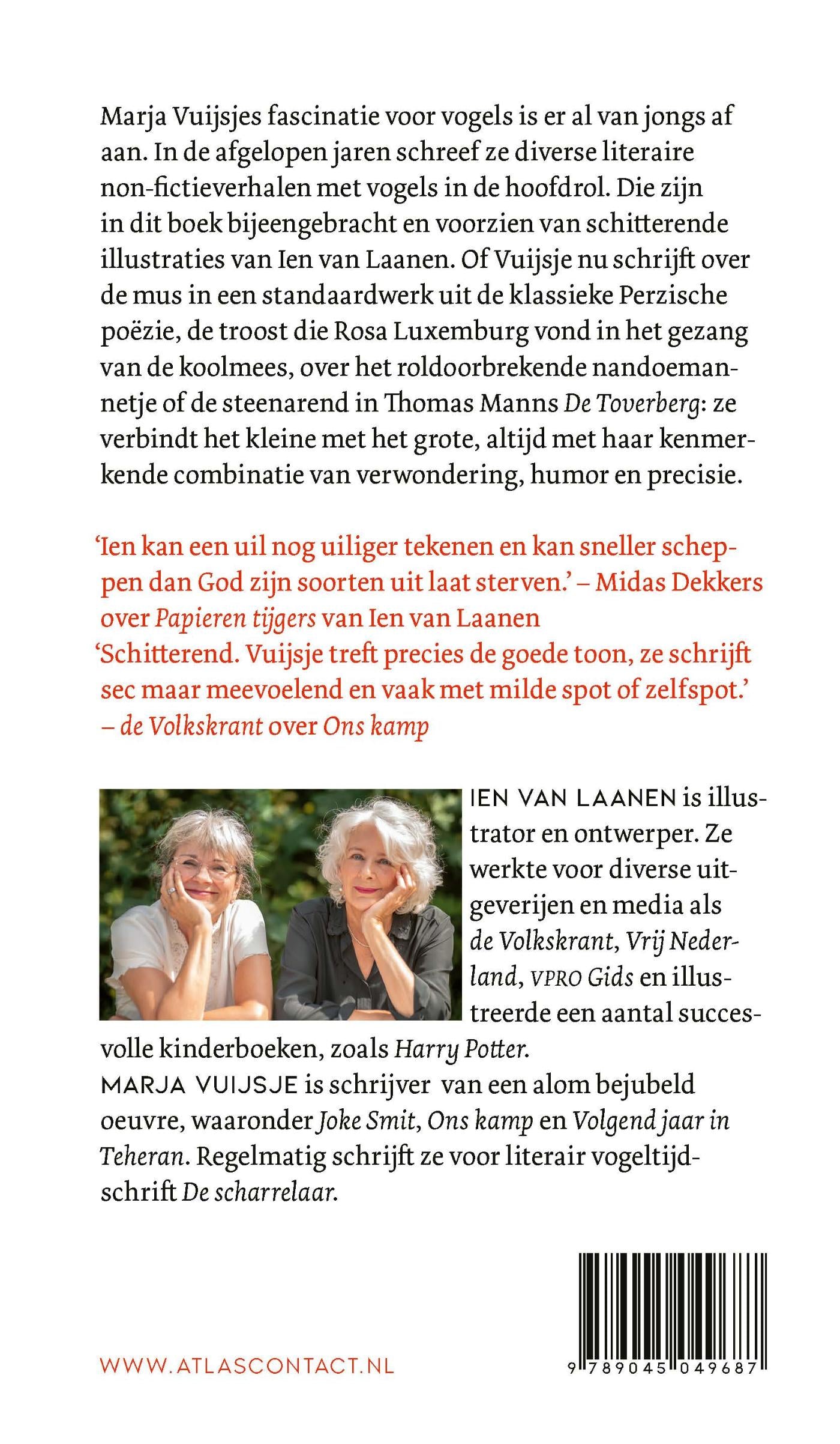 Zo opent het titelverhaal ‘Een eend op zolder’ – Marja Vuijsjes fascinatie voor vogels is er al van jongs af aan. In de afgelopen jaren schreef ze diverse literaire non-fictieverhalen met vogels in de hoofdrol. Die zijn in dit boek bijeengebracht en voorzien van schitterende illustraties van Ien van Laanen. Of Vuijsje nu schrijft over de mus in een standaardwerk uit de klassieke Perzische poëzie, de troost die Rosa Luxemburg vond in het gezang van de koolmees, over het roldoorbrekende Nandoemannetje of de steenarend in Thomas Manns De toverberg: ze verbindt het kleine met het grote, altijd met haar kenmerkende combinatie van verwondering, intelligente humor en elegante precisie.