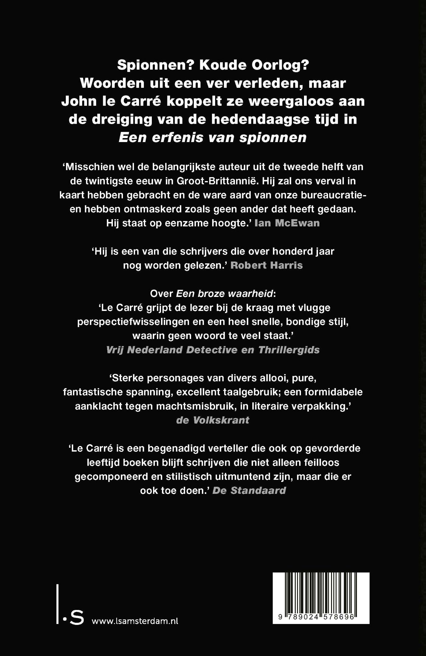 Met Een Erfenis van Spionnen grijpt meesterverteller John le Carré terug op zijn meest geliefde personage George Smiley en zijn bestsellers Spion aan de Muur en Edelman, Bedelman, Schutter, Spion. In een verhaal dat zindert van de spanning, de humor en de morele ambivalentie, confronteert Le Carré de lezer met een nalatenschap van onvergetelijke personages, zowel oude als nieuwe.