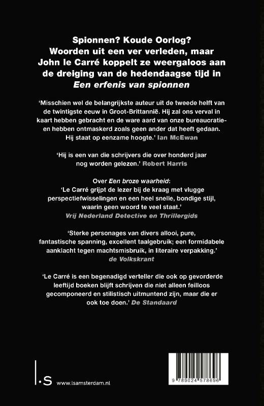 Met Een Erfenis van Spionnen grijpt meesterverteller John le Carré terug op zijn meest geliefde personage George Smiley en zijn bestsellers Spion aan de Muur en Edelman, Bedelman, Schutter, Spion. In een verhaal dat zindert van de spanning, de humor en de morele ambivalentie, confronteert Le Carré de lezer met een nalatenschap van onvergetelijke personages, zowel oude als nieuwe.