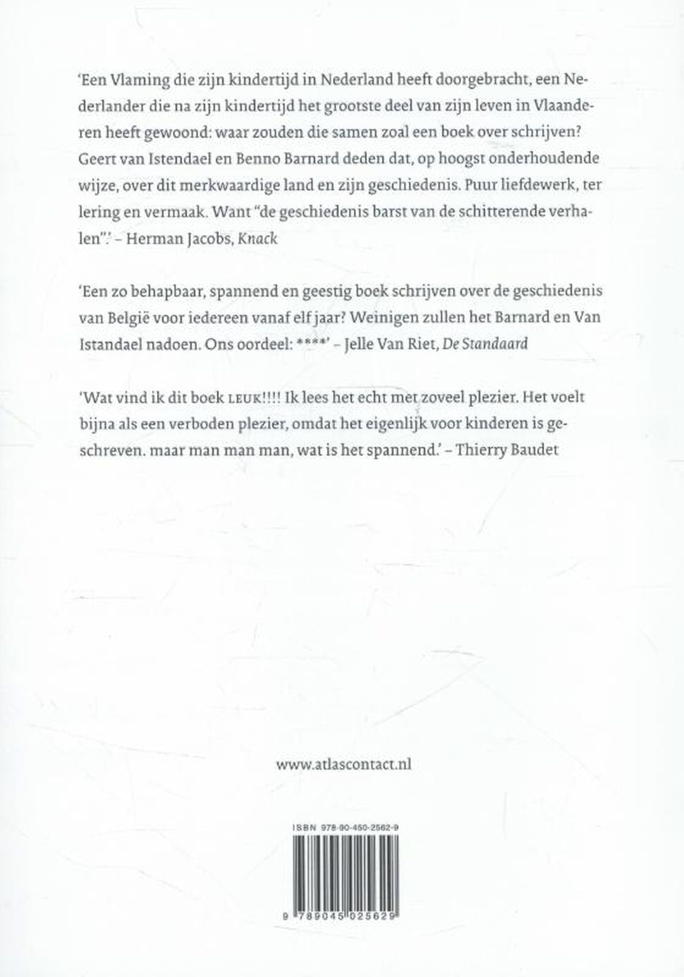 Karel de Grote is ons allen welbekend en de Guldensporenslag op 11 juli 1302 zeker ook. Maar wie weet dat die dag het sterkste ridderleger van Europa verslagen werd door slagers en wevers? Hoeveel rechtgelovige mensen heeft de wrede hertog van Alva op de brandstapel gebracht? Waarom staat in Waterloo die leeuw op zijn rare heuvel? Vanaf de prehistorie tot aan het heden geven Benno Barnard en Geert van Istendael een schat aan verhalen over de geschiedenis van België, vol avonturen, over dappere helden en sinistere schurken. Verhalen over figuren en gebeurtenissen die u zich nog vaag zult herinneren van de middelbare school, worden hier in geuren en kleuren heropgedist, met prachtige illustraties van Judith Vanistendael, zodat u eens te meer aan uw eigen kinderen kunt bewijzen: geschiedenis hoeft nooit saai te zijn!