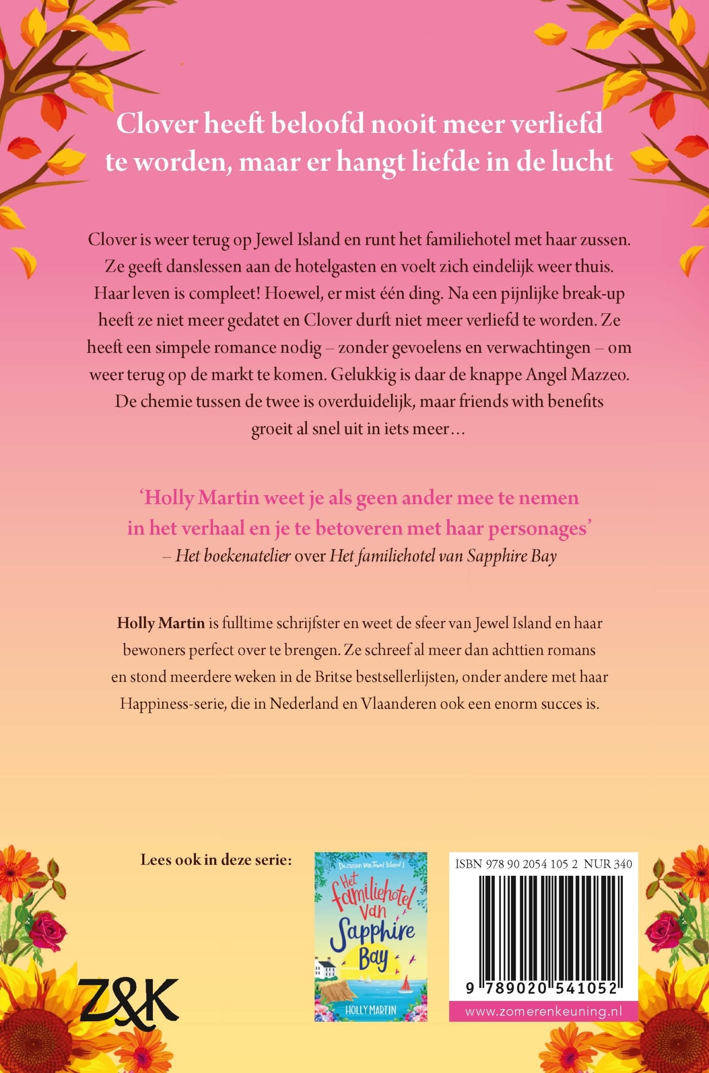 Clovers leven is compleet! Ze is weer terug op Jewel Island, runt het familiehotel met haar zussen en is dolgelukkig. Hoewel... er mist één ding. Een paar jaar geleden is ze bedrogen door haar ex en sindsdien heeft ze zich niet meer open durven stellen voor de liefde. De knappe Angel Mazzeo wil haar helpen om weer aan het daten te slaan. Maar friends with benefits groeit al snel uit in iets meer… 'Een gouden gloed over Ruby Falls' van Holly Martin is een heerlijk feelgoodverhaal. Lees ook de andere delen van deze sprankelende serie: 'Het familiehotel van Sapphire Bay' en 'De zoete verleiding van Emerald Cove'.