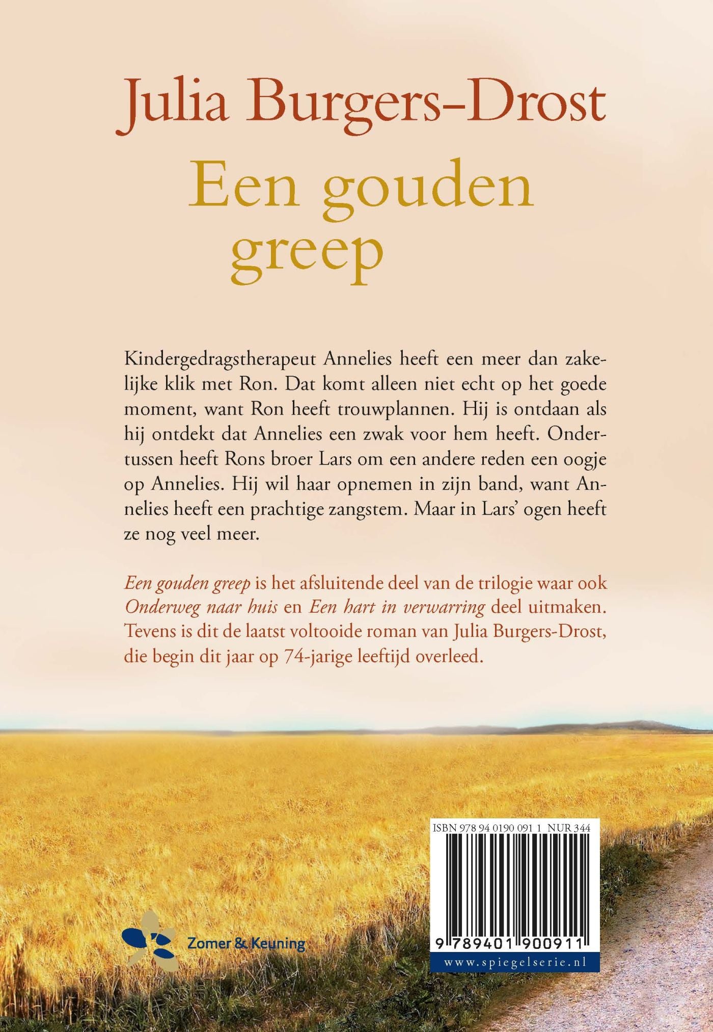 Een gouden greep is het afsluitende deel van een trilogie na Onderweg naar huis en Een hart in verwarring. Tevens is het de laatste roman van Julia Burgers-Drost, die begin dit jaar op 74-jarige leeftijd overleed.