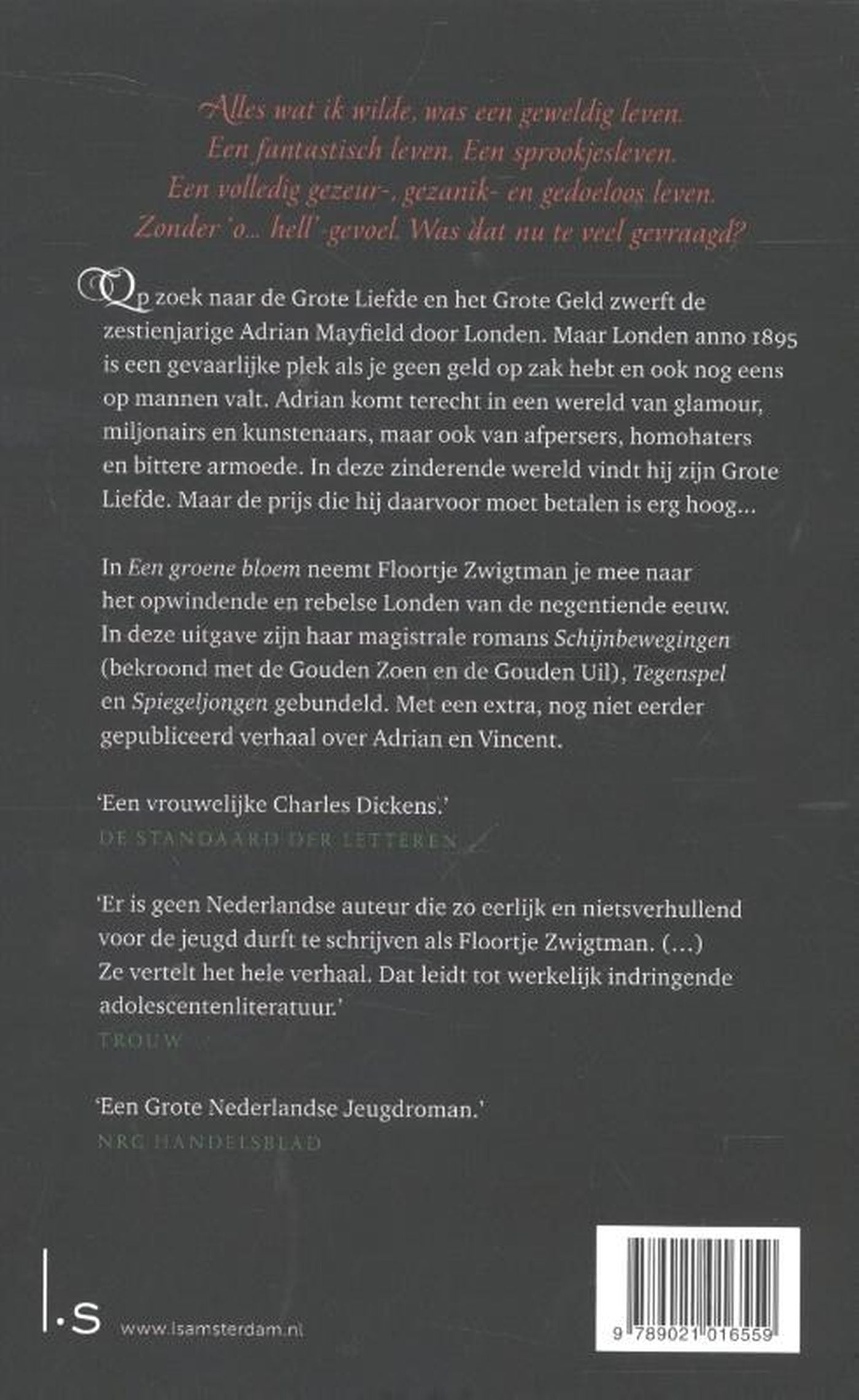 In Een groene bloem neemt Floortje Zwigtman je mee naar het opwindende en rebelse Londen van de negentiende eeuw. In deze uitgave zijn haar magistrale romans Schijnbewegingen (bekroond met de Gouden Zoen en de Gouden Uil), Tegenspel en Spiegeljongen gebundeld. Met een extra, nog niet eerder gepubliceerd verhaal over Adrian en Vincent!