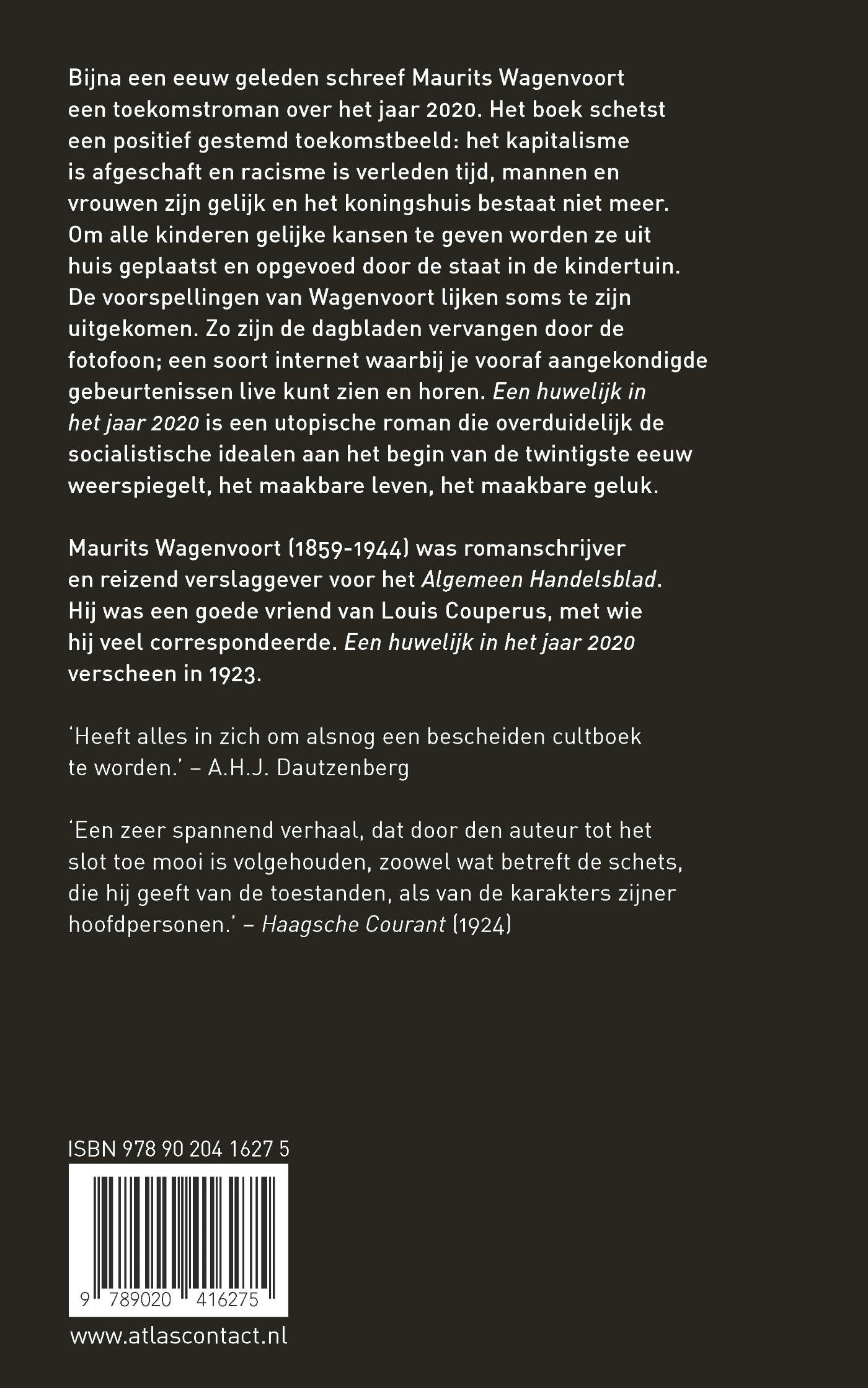 Bijna een eeuw geleden schreef Maurits Wagenvoort de toekomstroman: ‘Een huwelijk in het jaar 2020’. Het boek schetst een positief gestemd toekomstbeeld: het kapitalisme is afgeschaft en racisme is verleden tijd, mannen en vrouwen zijn gelijk en het koningshuis bestaat niet meer. Om alle kinderen gelijke kansen te geven worden ze uit huis geplaatst en opgevoed door de staat in de kindertuin. De voorspellingen van Wagenvoort lijken soms te zijn uitgekomen. Zo zijn de dagbladen vervangen door de fotofoon; een soort internet waarbij je vooraf aangekondigde gebeurtenissen live kunt zien en horen. ‘Een huwelijk in het jaar 2020’ is een utopische roman die overduidelijk de socialistische idealen aan het begin van de twintigste eeuw weerspiegelt, het maakbare leven, het maakbare geluk.