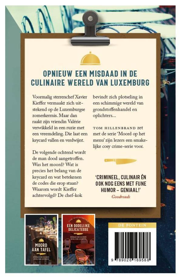 Een ingrediënt voor moord is het derde boek in de 'culi cozy crime' Moord op het menu-serie van Tom Hillenbrand. De avonturen van Xavier Kieffer begonnen in Moord aan tafel en Een dodelijke delicatesse.