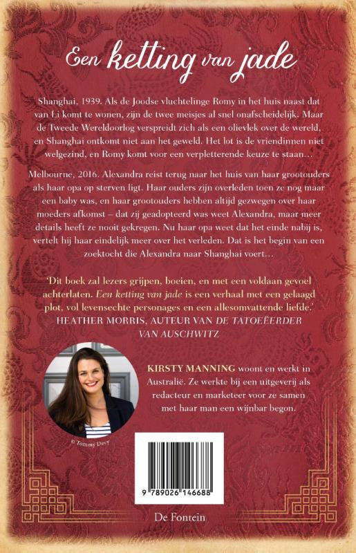 'Een ketting van jade' van Kirsty Manning is een verhaal met een gelaagd plot, vol levensechte personages en een allesomvattende liefde.’ - Heather Morris, auteur van 'De tatoeëerder van Auschwitz'