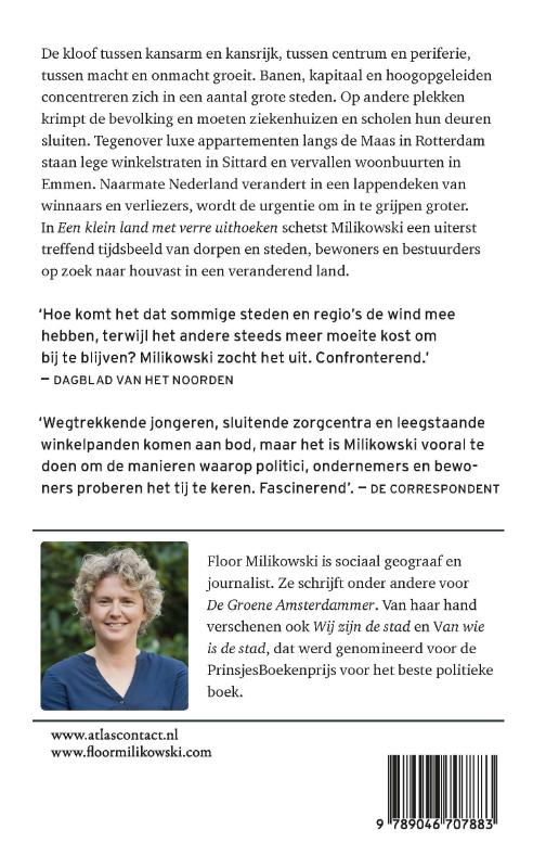 In ‘Een klein land met verre uithoeken’ schetst geograaf en journalist Floor Milikowski een uiterst treffend tijdsbeeld van dorpen en steden. Bewoners en bestuurders zijn op zoek naar houvast in een veranderd land. In Nederland groeit de kloof tussen kansarm en kansrijk, tussen centrum en periferie, tussen macht en onmacht. Banen, kapitaal en hoogopgeleiden concentreren zich in een aantal grote steden. Op andere plekken krimpt de bevolking en moeten ziekenhuizen en scholen hun deuren sluiten. Het succes van de ene plek gaat ten koste van de welvaart elders. Naarmate Nederland verandert in een lappendeken van winnaars en verliezers, wordt de urgentie om in te grijpen groter. Hoe willen we dat het land eruitziet – en wie kan, wil of moet daar invloed op uitoefenen?