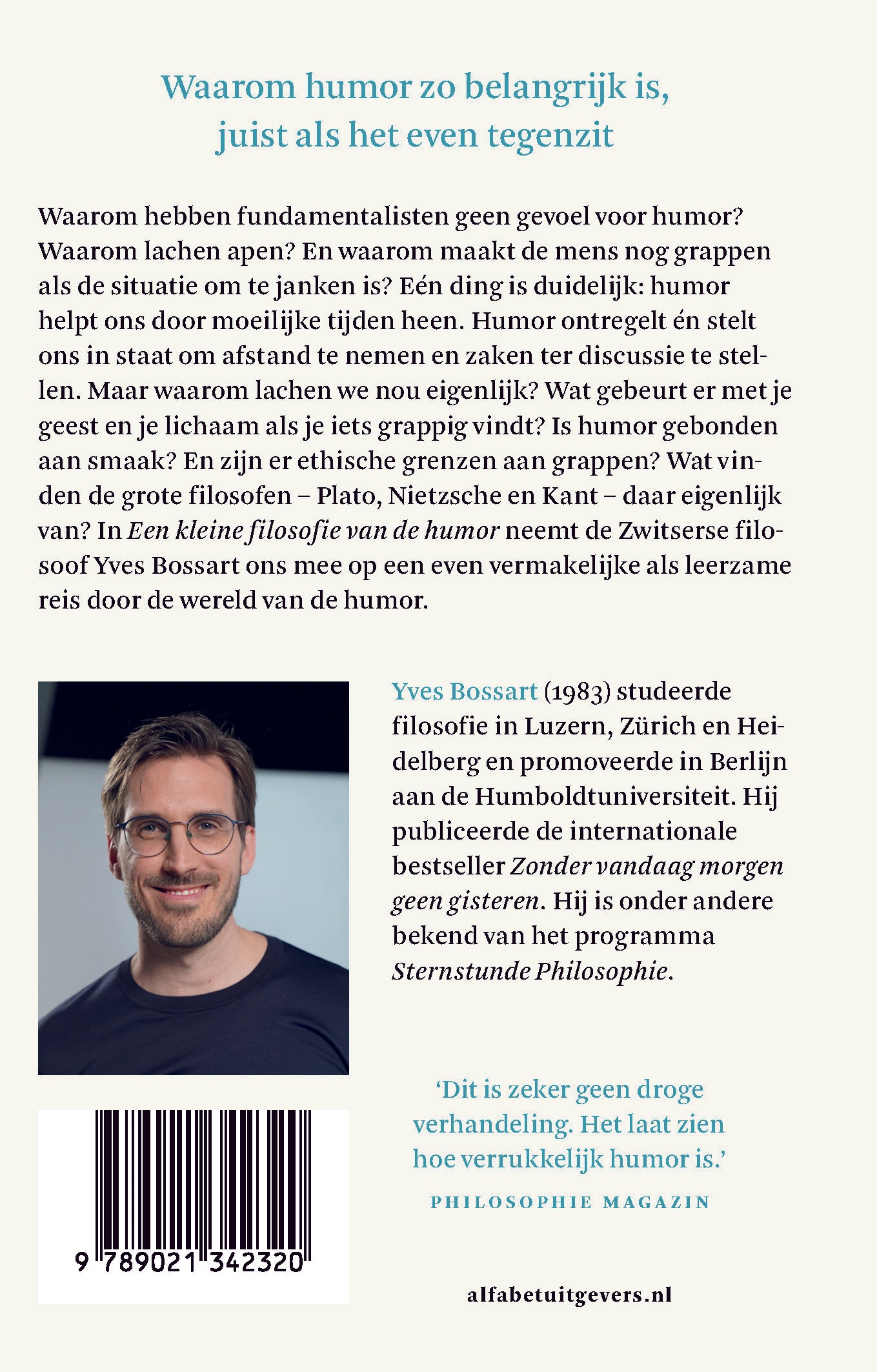 Waarom hebben fundamentalisten geen gevoel voor humor? Waarom lachen apen? Waarom maakt de mens nog grappen als de situatie om te janken is? Eén ding is duidelijk: humor helpt ons door moeilijke tijden heen. Humor ontregelt én stelt ons in staat om enige afstand te nemen en zaken ter discussie te stellen. Maar waarom lachen we nou eigenlijk? Wat gebeurt er met je geest en je lichaam als je iets grappig vindt? Is humor gebonden aan smaak? En zijn er ethische grenzen aan grappen? Wat vinden de grote filosofen – Plato, Nietzsche en Kant – daar eigenlijk van? In 'Een kleine filosofie van de humor' neemt de Zwitserse filosoof Yves Bossart ons mee op een even vermakelijke als leerzame reis door de wereld van de humor.