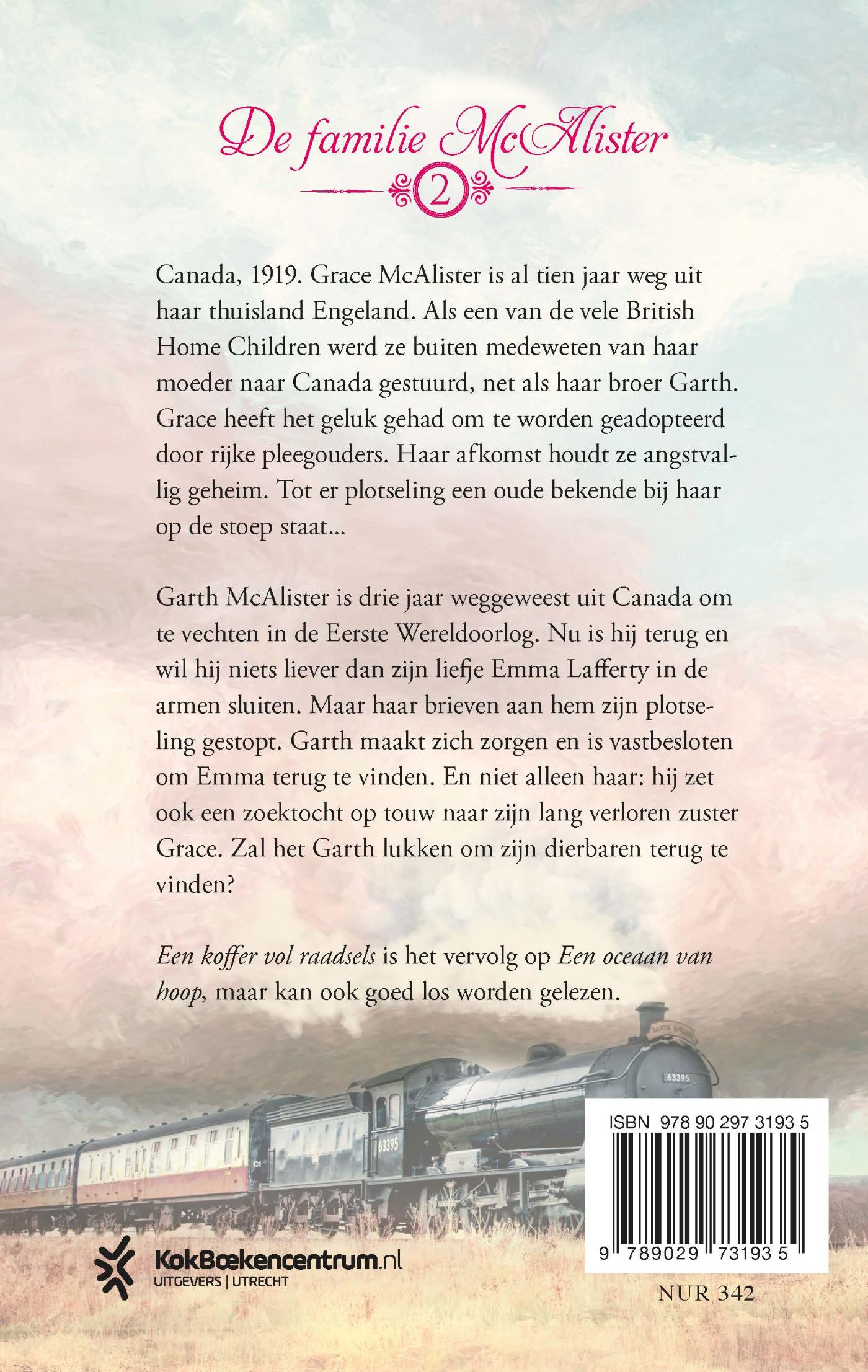 Een koffer vol raadsels van Carrie Turansky is het spannende en romantische vervolg op Een oceaan van hoop in het tweeluik De familie McAlister. Het is 1919. Tien jaar geleden werd Garth buiten medeweten van zijn moeder om naar Canada gebracht om te werken. Nu is hij vastberaden om ook zijn zusje in Canada op te sporen – evenals zijn geliefde van wie hij al maanden niets heeft gehoord. Lukt het Garth om zijn dierbaren weer bij elkaar te brengen?