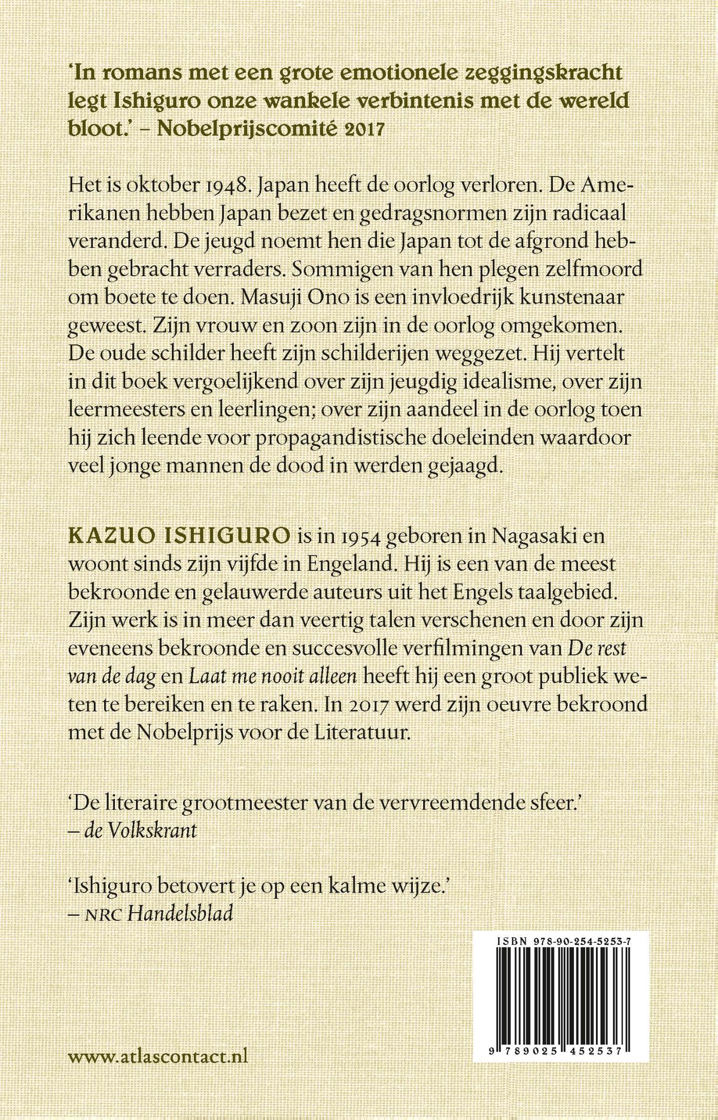 ‘Een kunstenaar van het vlietende leven’ van Kazuo Ishiguro speelt in oktober 1948. Japan heeft de oorlog verloren. De Amerikanen hebben Japan bezet en gedragsnormen zijn radicaal veranderd. De jeugd noemt hen die Japan tot de afgrond hebben gebracht verraders. Sommigen van hen plegen zelfmoord om boete te doen. Masuji Ono is een invloedrijk kunstenaar geweest. Zijn vrouw en zoon zijn in de oorlog omgekomen. De oude schilder heeft zijn schilderijen weggezet. Hij vertelt in dit boek vergoelijkend over zijn jeugdig idealisme, over zijn leermeesters en leerlingen; over zijn aandeel in de oorlog toen hij zich leende voor propagandistische doeleinden waardoor veel jonge mannen de dood in werden gejaagd.