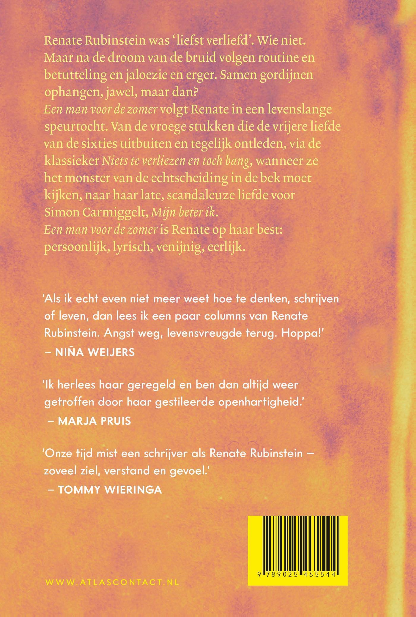 ‘Een man voor de zomer’ volgt Renate Rubinstein in een levenslange speurtocht. Van de vroege stukken die de vrijere liefde van de sixties uitbuiten en tegelijk ontleden, via de klassieker ‘Niets te verliezen en toch bang’, wanneer ze het monster van de echtscheiding in de bek moet kijken, naar haar late, scandaleuze liefde voor Simon Carmiggelt, ‘Mijn beter ik’.