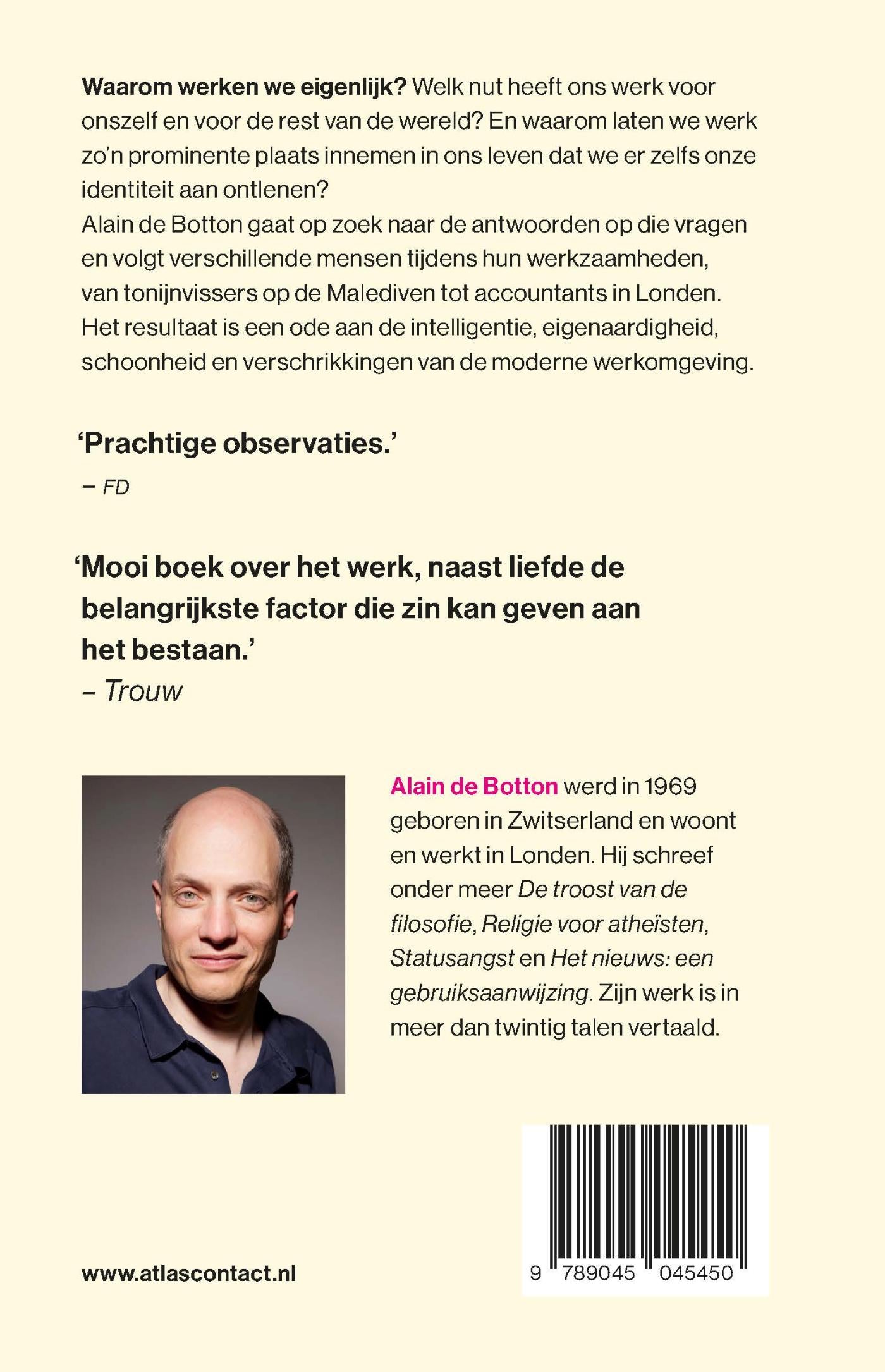 Waarom werken we eigenlijk? Welk nut heeft ons werk voor onszelf en voor de rest van de wereld? En waarom laten we werk zo’n prominente plaats innemen in ons leven dat we er zelfs onze identiteit aan ontlenen? Alain de Botton gaat op zoek naar de antwoorden op die vragen en volgt verschillende mensen tijdens hun werkzaamheden, van tonijnvissers op de Malediven tot accountants in Londen. Het resultaat is een ode aan de intelligentie, eigenaardigheid, schoonheid en verschrikkingen van de moderne werkomgeving, met als opmerkelijke conclusie dat werk, naast liefde, de belangrijkste factor is die zin kan geven aan ons bestaan.