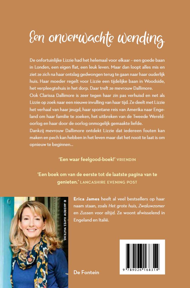 Erica James heeft naast ‘Een onverwachte wending’ reeds veel bestsellers op haar naam staan, zoals ‘De bloemenjaren’, ‘Schaduwleven’ en ‘Zussen voor altijd’.