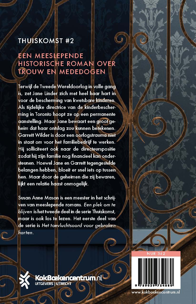 ‘Een plek om te blijven’ van Susan Anne Mason speelt zich af in Toronto, Canada. Terwijl de Tweede Wereldoorlog in volle gang is, zet Jane zich met heel haar hart in voor de bescherming van kwetsbare kinderen. Als tijdelijke directrice van de kinderbescherming hoopt ze op een permanente positie zodat ze zich hiervoor kan blijven inzetten. Maar ze bewaart een groot geheim dat haar ontslag zou kunnen betekenen.