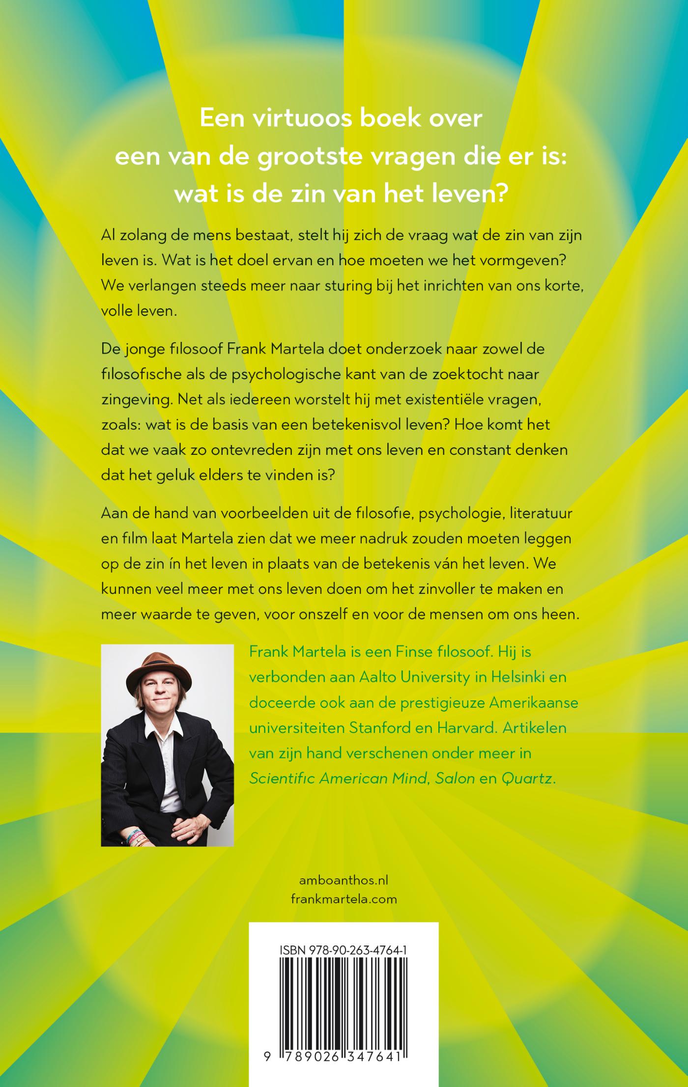 Tegenwoordig zijn veel mensen zoekende en komen burn-outs vaak voor. We verlangen steeds meer naar sturing bij het inrichten van ons korte, volle leven. De jonge filosoof Frank Martela doet onderzoek naar zowel de filosofische als de psychologische kant van de zoektocht naar de betekenis van ons leven. Net als iedereen worstelt hij met existentiële vragen, zoals: Wat is de basis van een betekenisvol leven? Is geluk een doel dat je kunt nastreven? Hoe komt het dat we vaak zo ontevreden zijn met ons leven en constant denken dat het geluk te vinden is op een plek ver van ons vandaan?